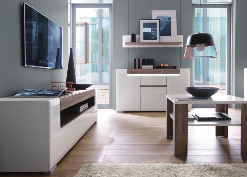 Lehce futuristické sérii nábytku Toronto dominuje bílá barva, zapracované má prvky z hnědého dřeva - ty jsou ve vzoru san remo. Ozvláštní jakýkoliv obývací pokoj nebo jídelnu. Vybírejte originální skříně, komody, police, předsíňové stěny a tv stolky.
