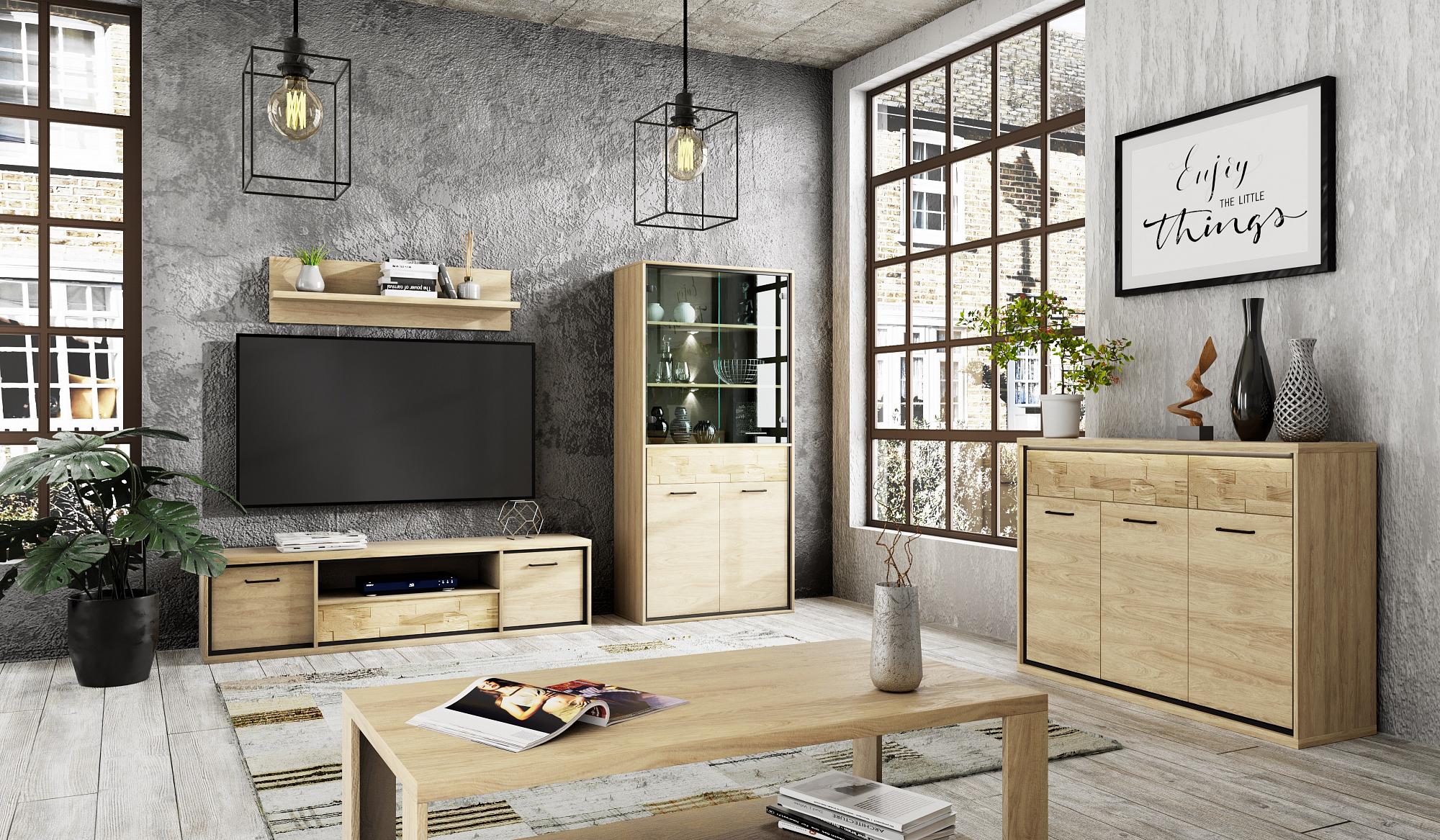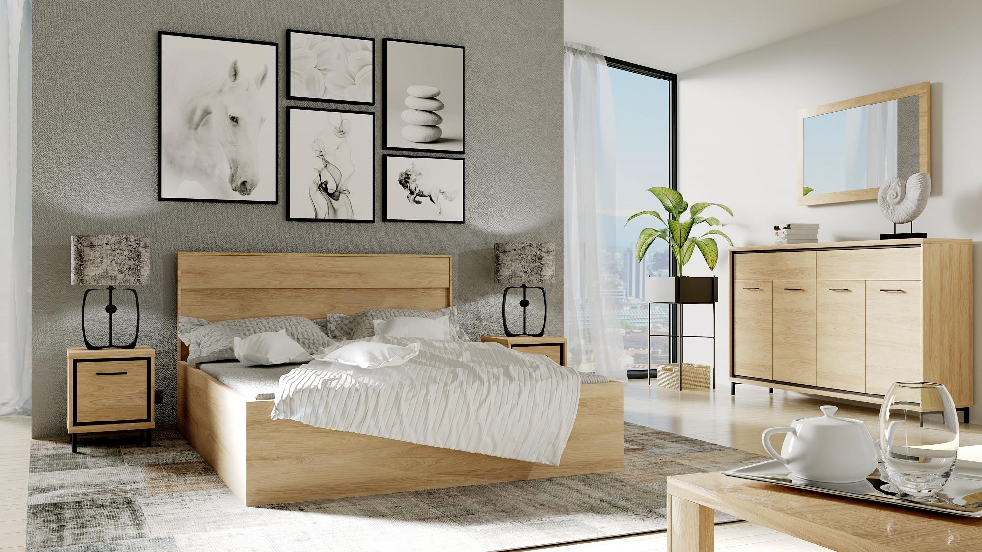 Teplé barvy s černými doplňky vykouzlí interiér v industriálním stylu. Hladká čela zásuvek můžete vyměnit za panel z dubového dřeva s ozdobným vzorem. Doplňkové LED osvětlení obohatí každý interiér. Vybírejte šatní skříně s posuvnými dveřmi, noční stolky i manželskou postel.