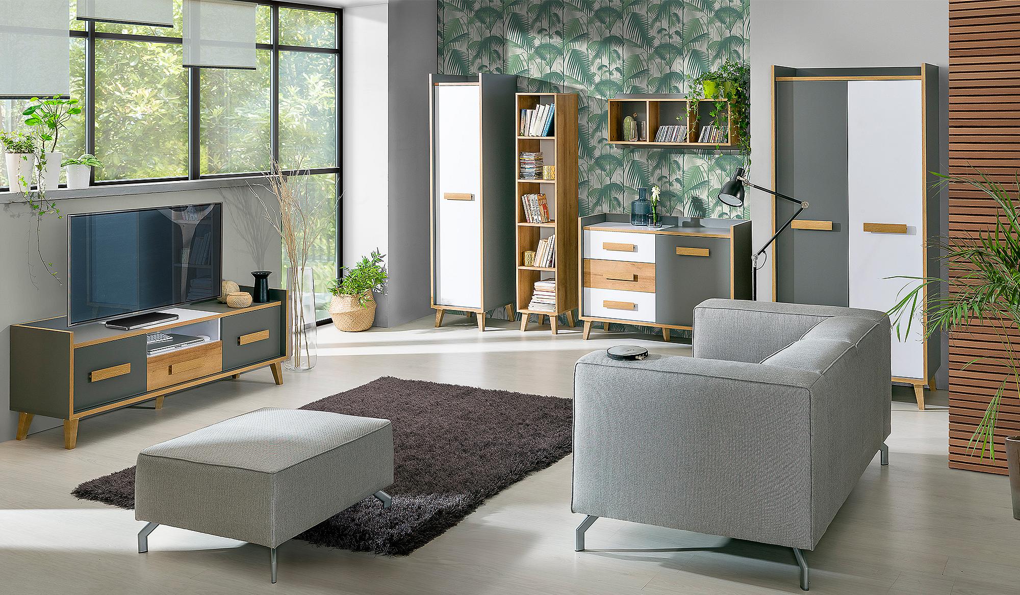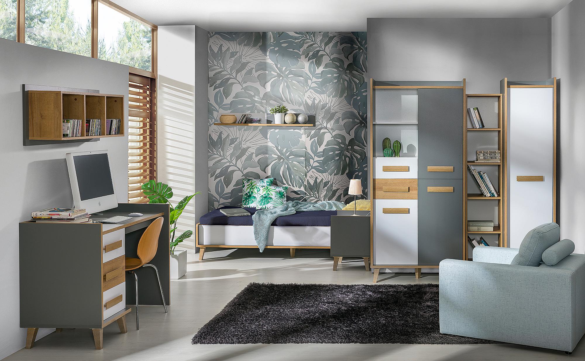 Netradiční kolekce Vero je primárně určena do pokojů pro děti a studenty, ale dá se použít i do obývacího pokoje. Nábytek stojí na nožkách, což oceníte hlavně při úklidu. Dub Riviera, Antracit a bílá barva – Opravdu hodně svérázná kombinace. Materiály: LTD, ABS