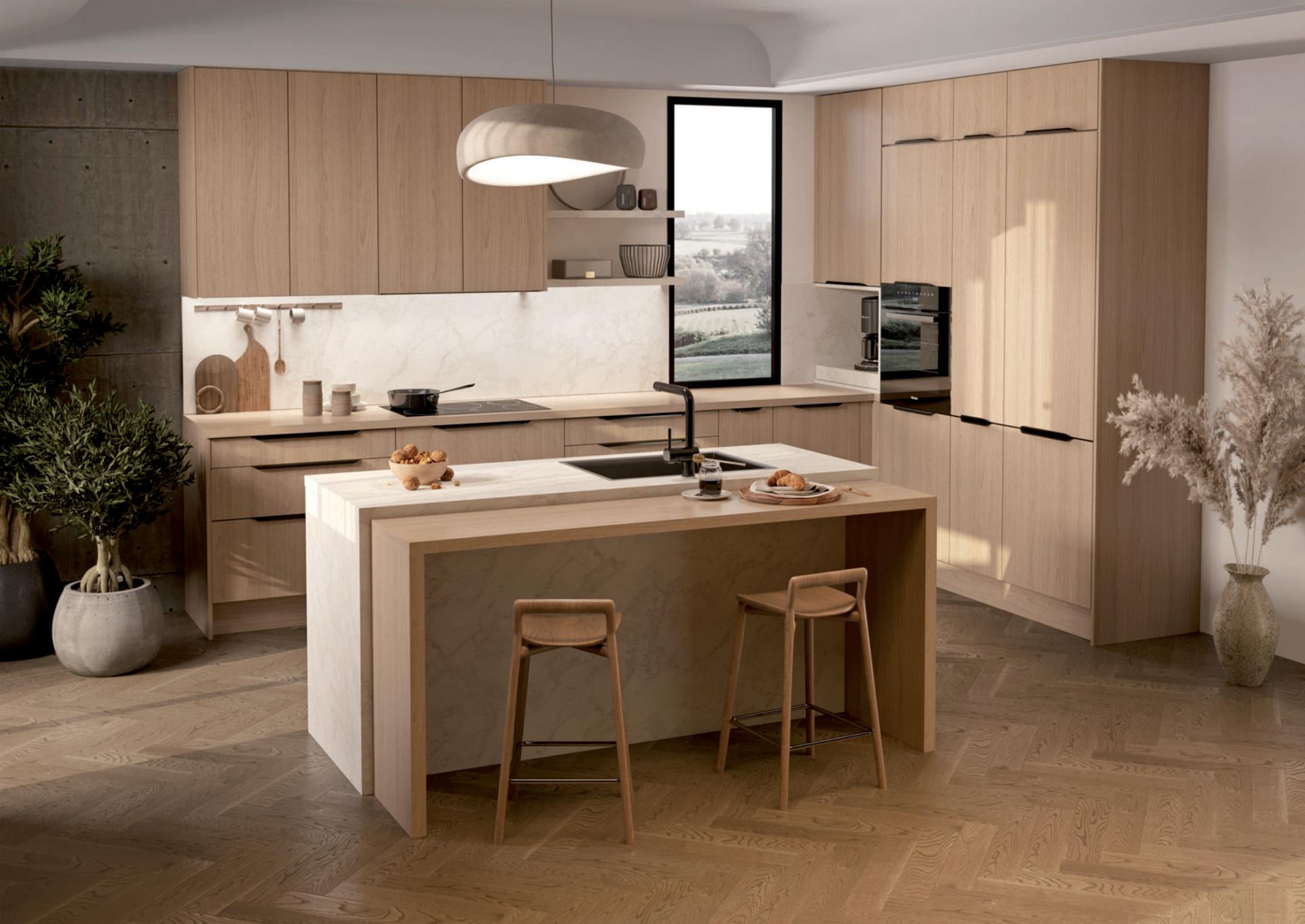 Moderní kuchyně Mono KC nabízí integrované hliníkové úchytky v černé barvě, dostupné v 5 různých délkách podle šířky skříňky. Populární dekory dřeva můžete volně kombinovat s lesklými nebo matnými barvami dvířek, které jsou navíc opatřeny ochranou proti poškrábání a otiskům prstů.