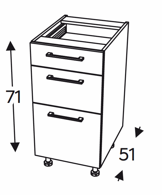 Výška nezahrnuje nožky (10 nebo 15 cm) a pracovní desku.