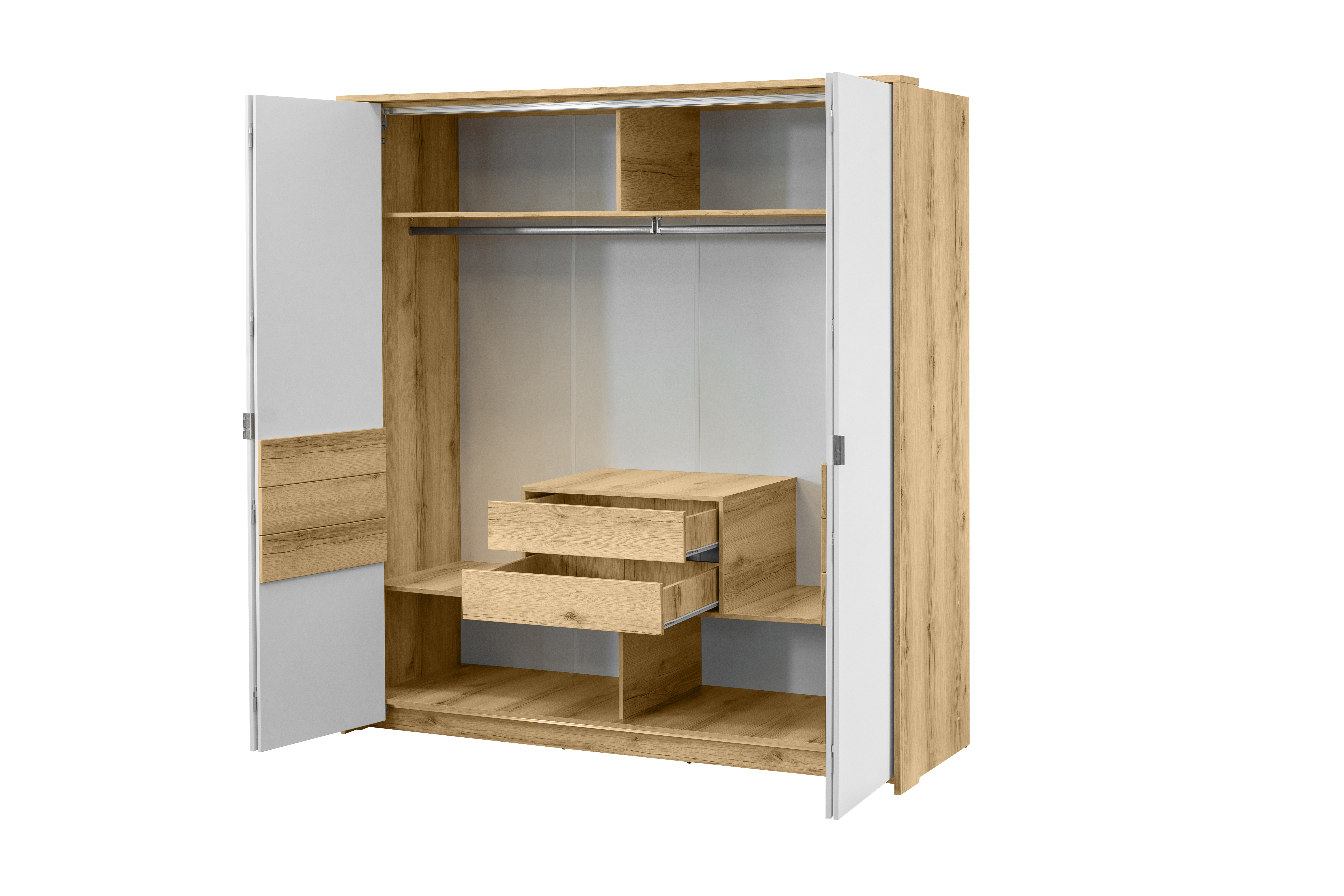Harmonie moderních prvků přírodního dřeva v kombinaci s čistými bílými plochami přináší do interiéru svěží a nadčasový vzhled. Elegantní šatní skříně, noční stolky a manželské postele spojují funkčnost s moderním designem.