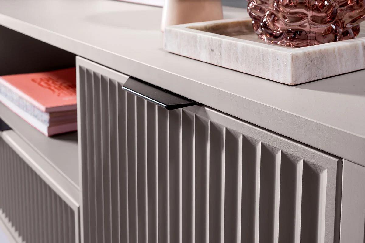 Obývací sestava Linas vyniká moderním designem s důrazem na vertikální žebrování, které dodává nábytku výraznou strukturu a hloubku. Jemné barevné tóny a elegantní kovové úchytky vytvářejí harmonii mezi funkčností a estetickým vzhledem, což činí tento nábytek ideální volbou pro stylové a sofistikované interiéry.