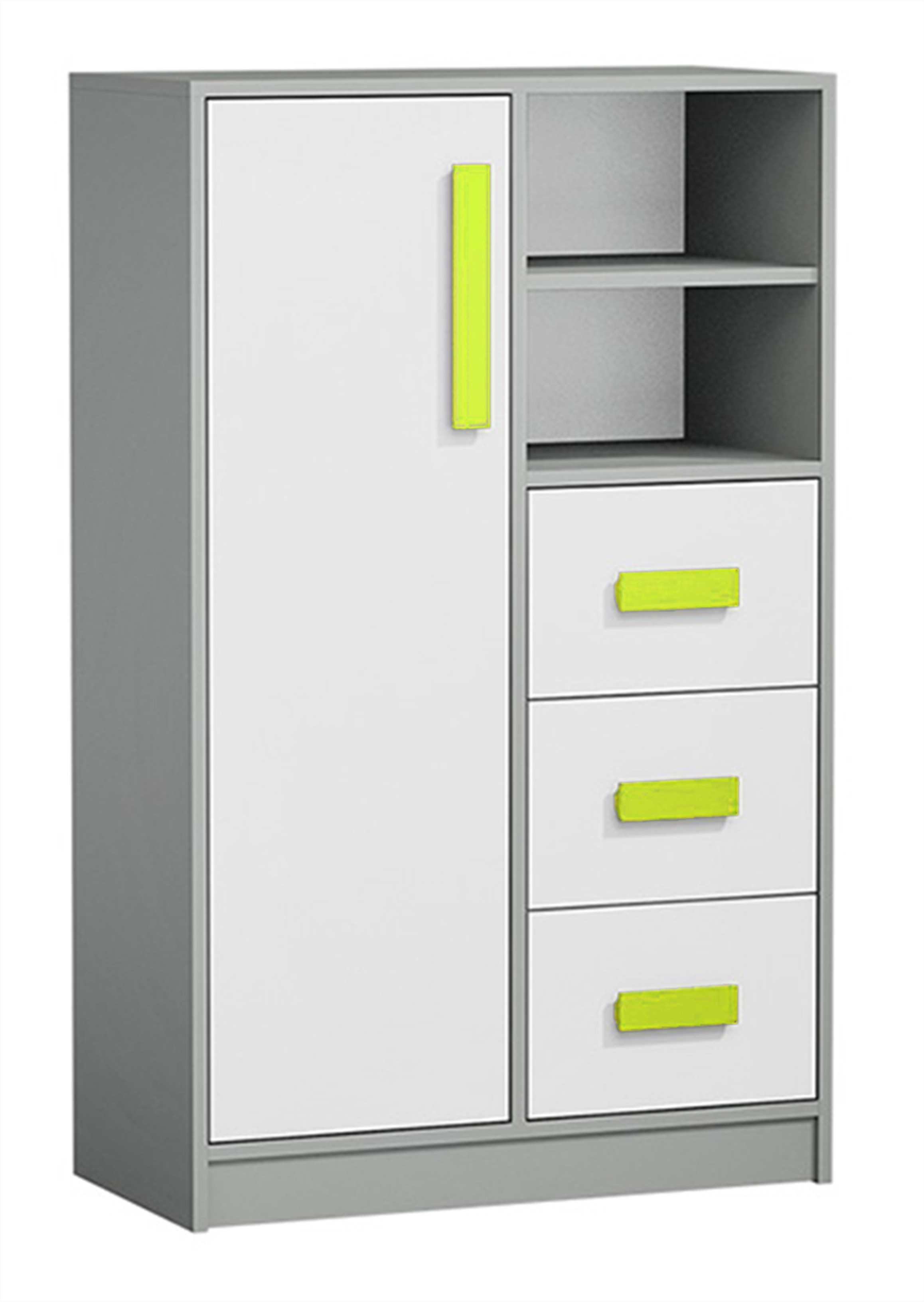 Dětská sestava Giro má barevná provedení, která zahrnují bílou přední stranu, antracitové tělo a plastové rukojeti v různých barvách (zelená, červená, modrá, fialová, šedá). Každý produkt v sestavě je vyroben z laminované desky o tloušťce 16 mm s ABS hranami, kuličkovým vedením v zásuvkách. Hodí se do dětského nebo studentského pokoje pro holky i pro kluky.