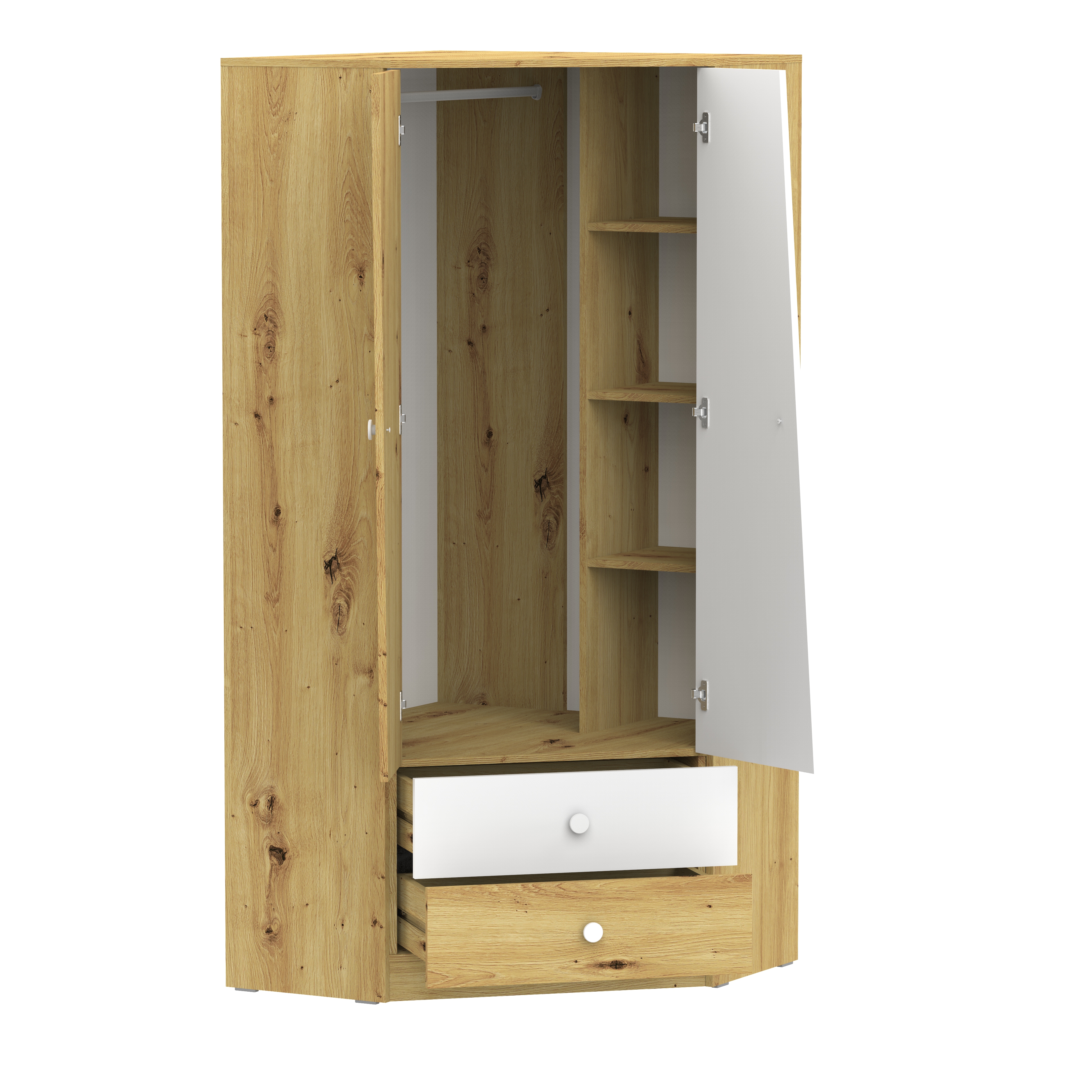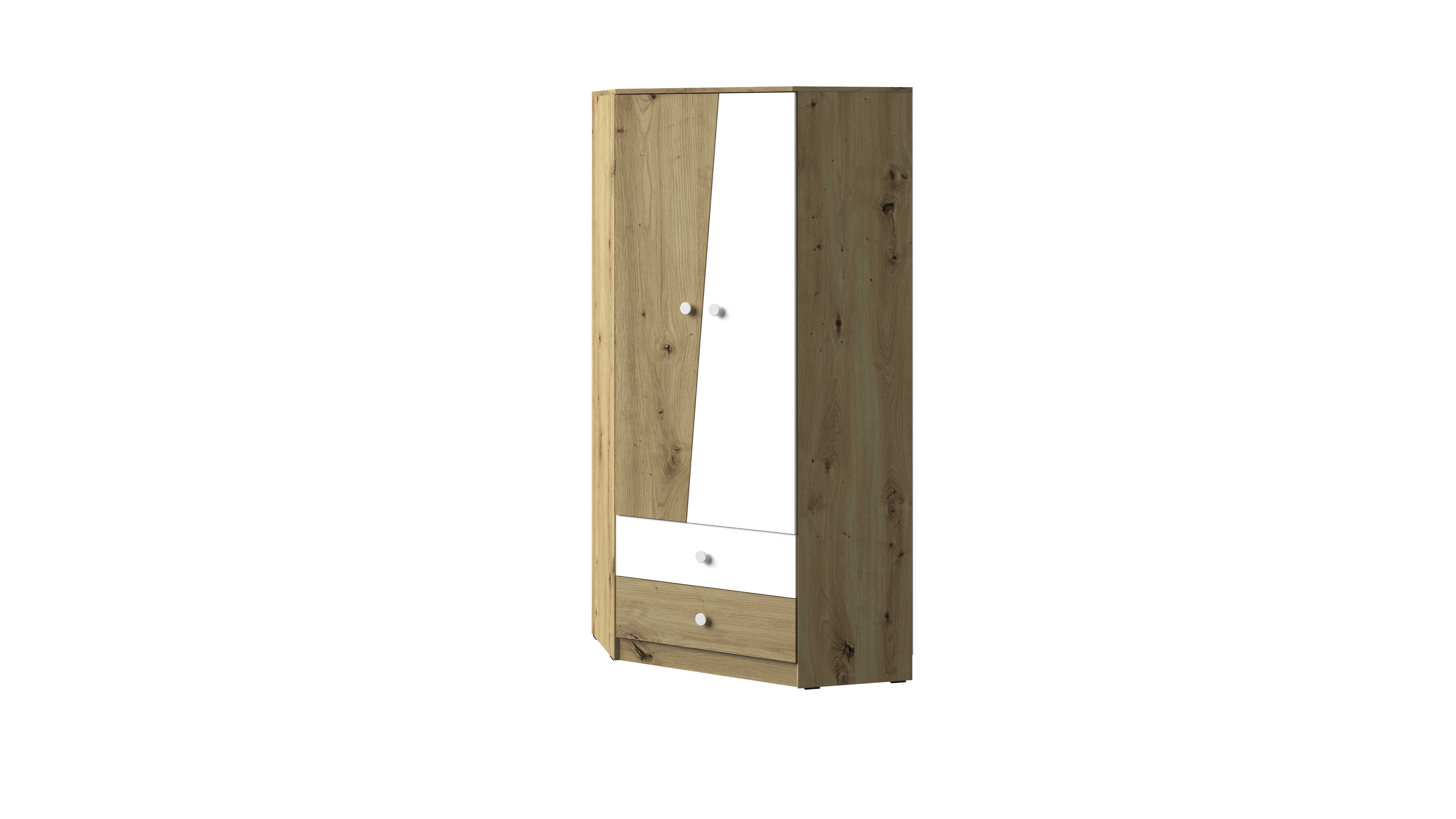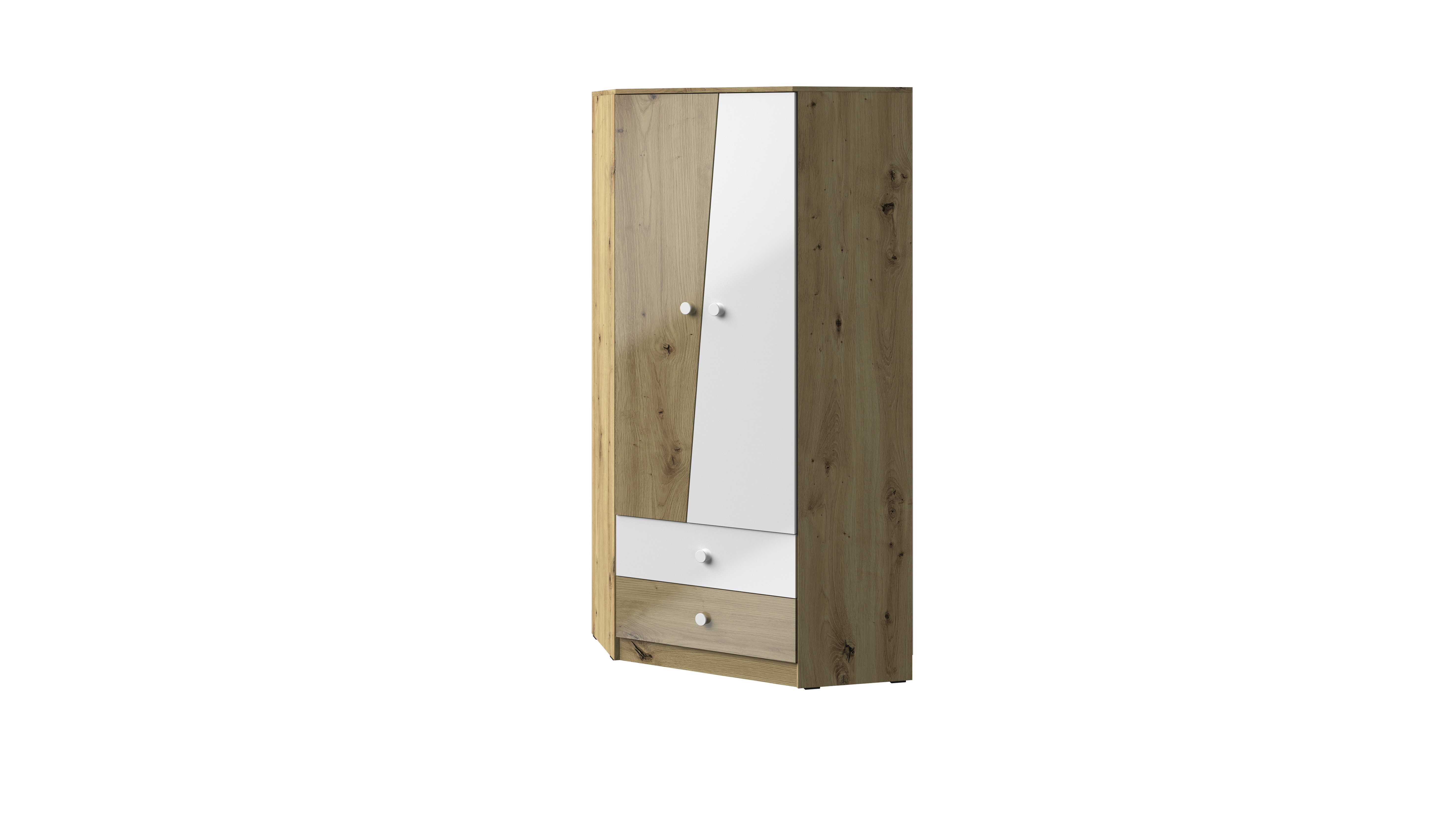 Rohová šatní skříň Neva 02 v elegantním designu s kombinací dekoru dřeva a bílými prvky. Poskytuje dostatek úložného prostoru díky policím a šatní tyči, ideální pro praktické uspořádání oblečení. Skříň je doplněna dvěma zásuvkami ve spodní části pro uložení drobností. Díky rohovému provedení je ideální pro využití prostoru v místnosti.