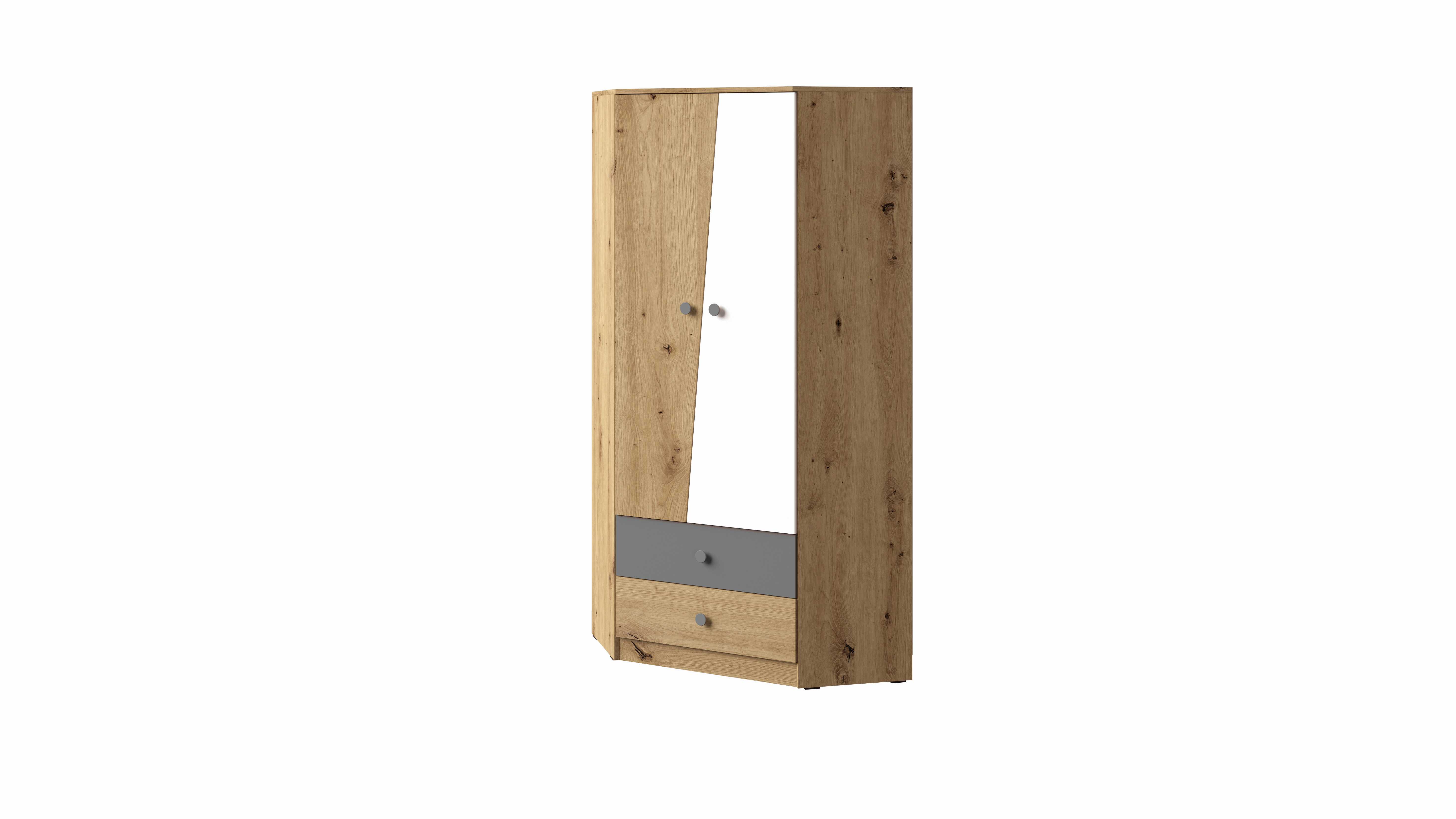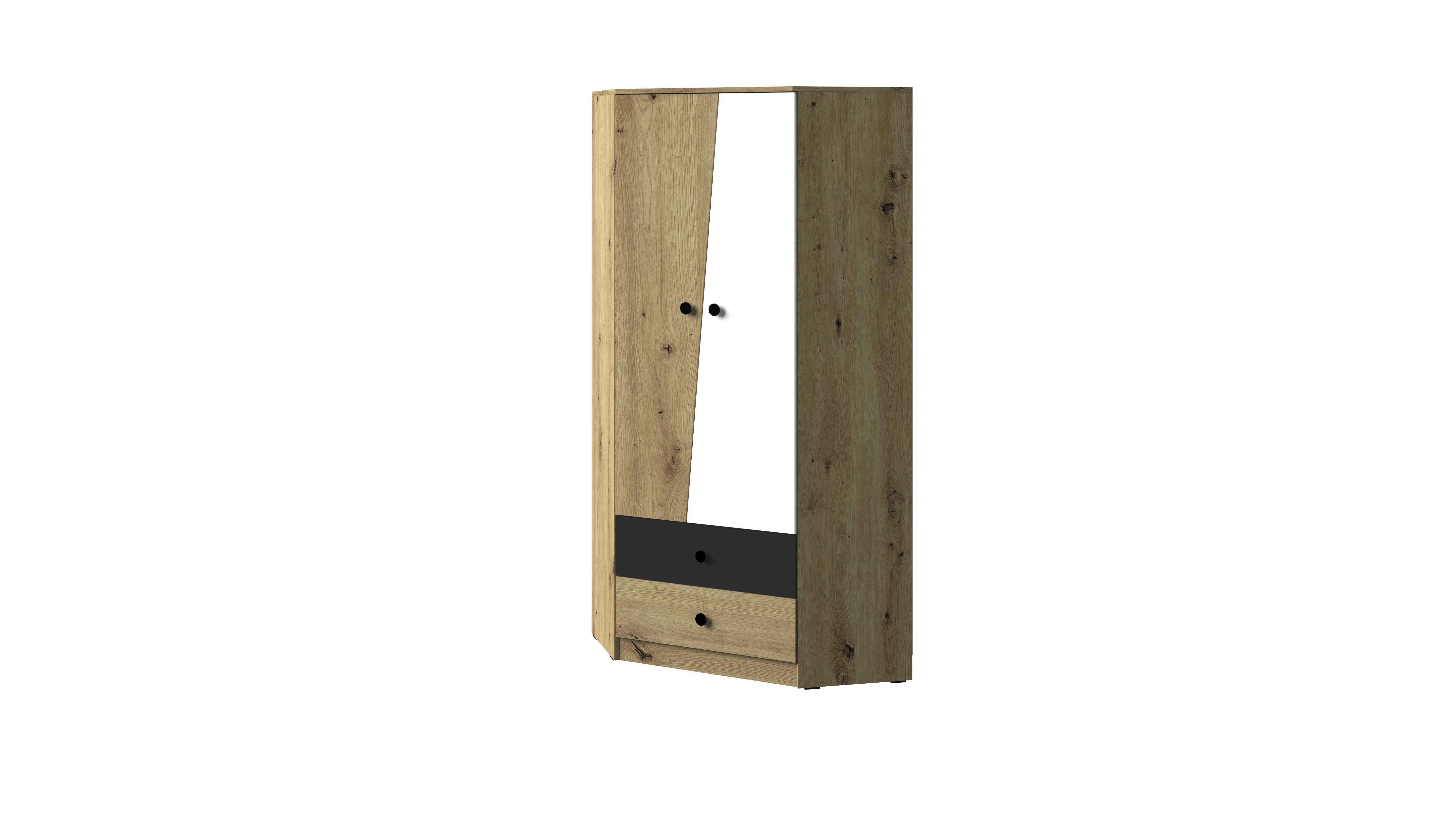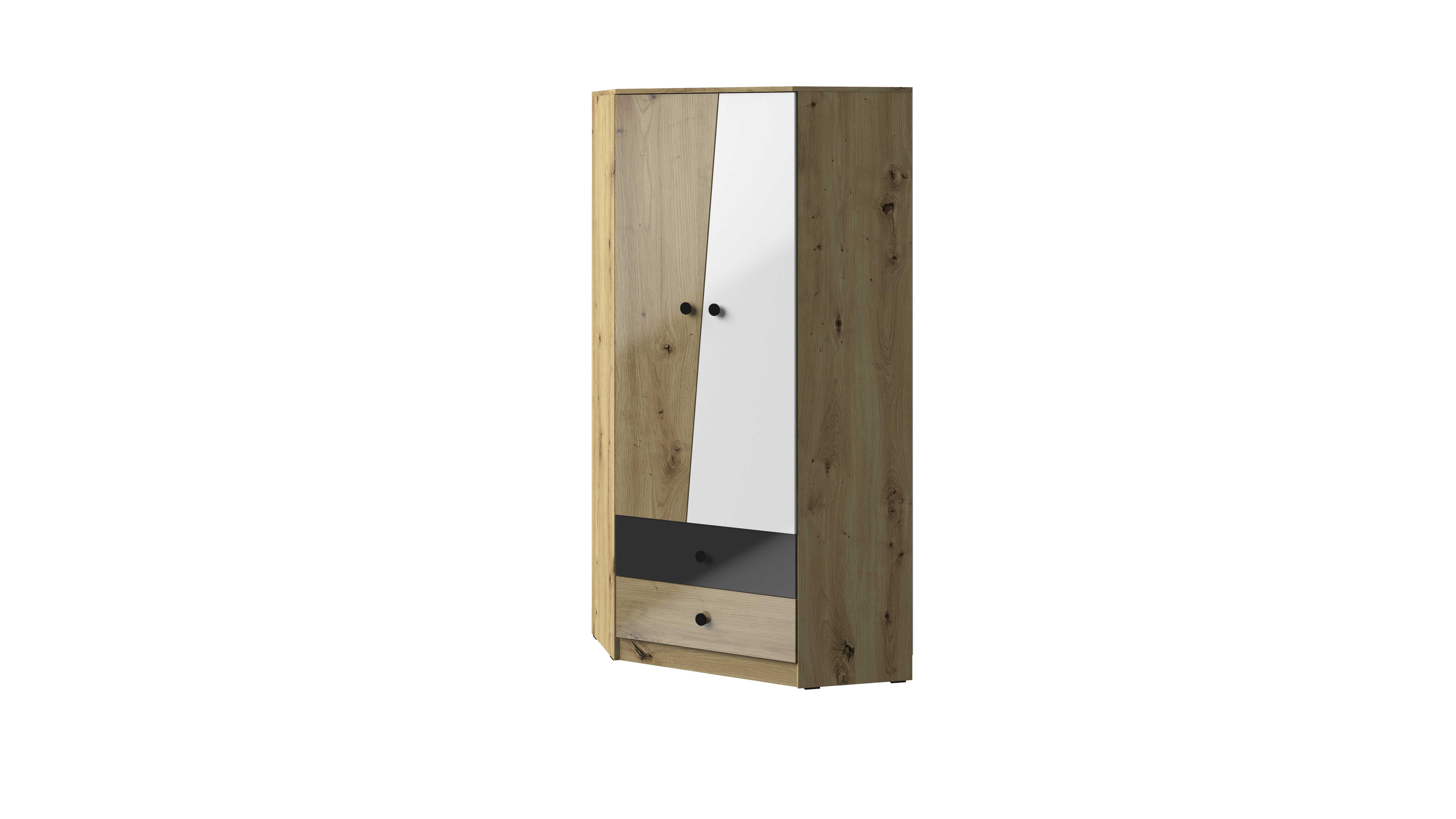 Rohová šatní skříň Neva 02 v elegantním designu s kombinací dekoru dřeva a bílými prvky. Poskytuje dostatek úložného prostoru díky policím a šatní tyči, ideální pro praktické uspořádání oblečení. Skříň je doplněna dvěma zásuvkami ve spodní části pro uložení drobností. Díky rohovému provedení je ideální pro využití prostoru v místnosti.