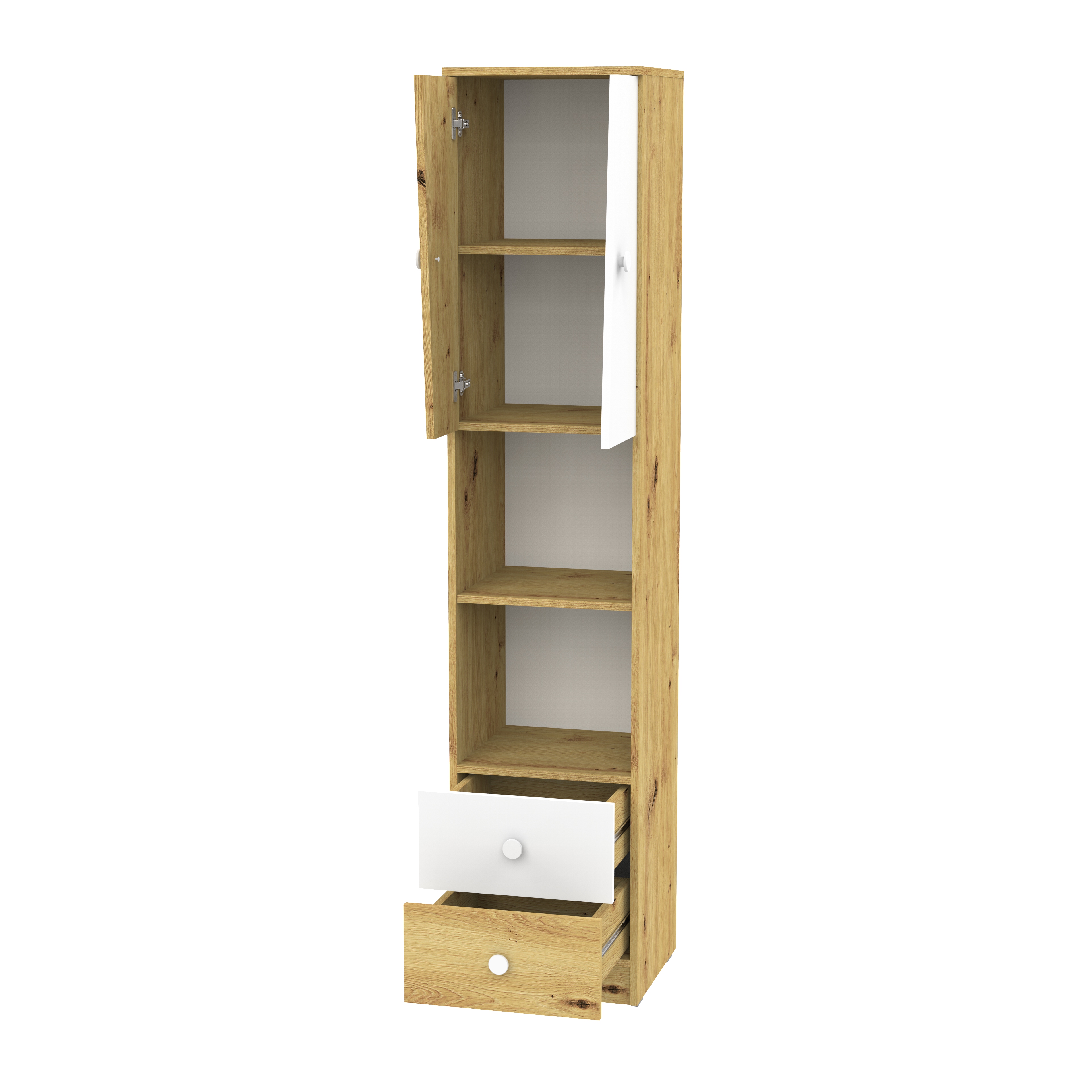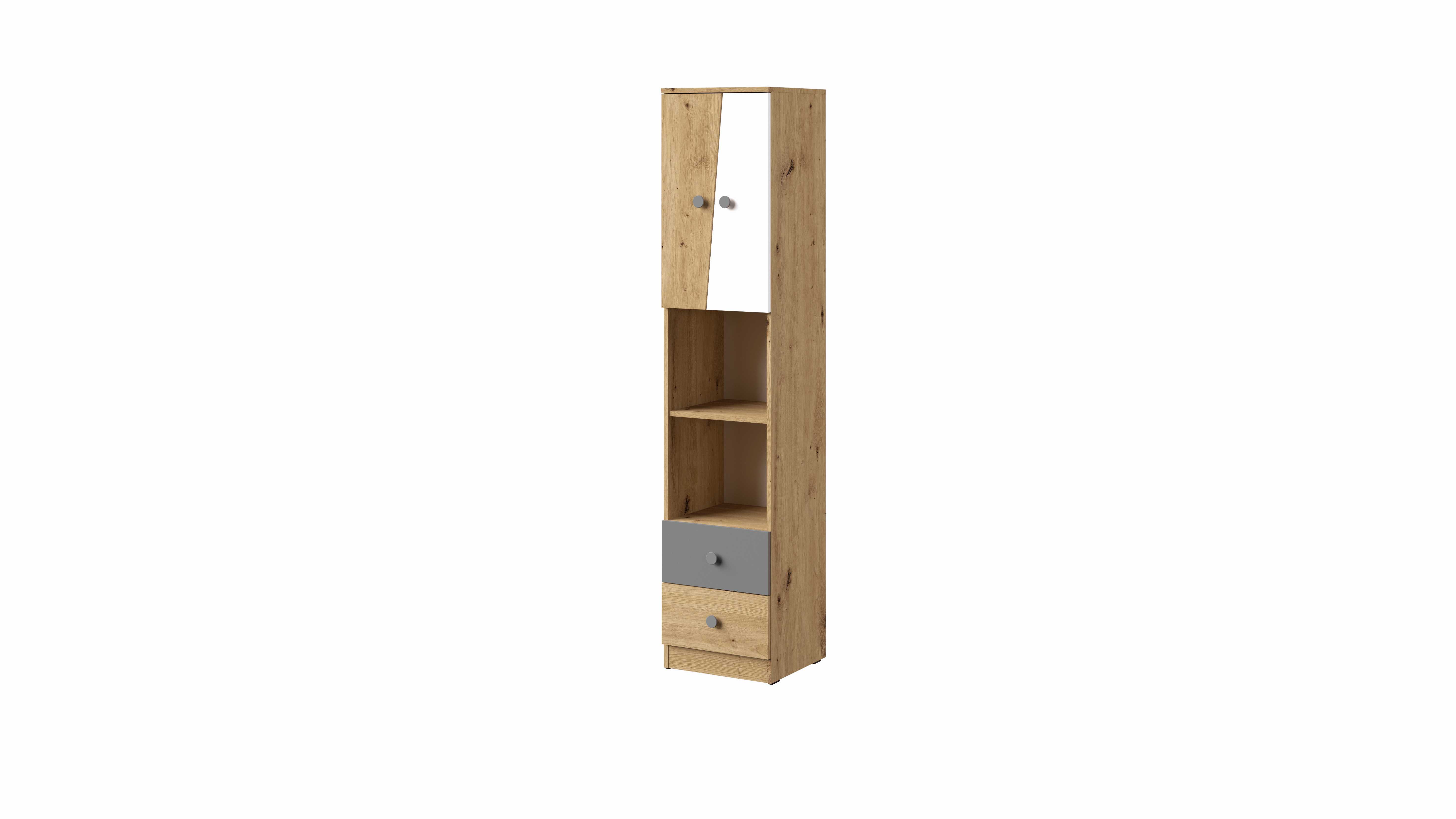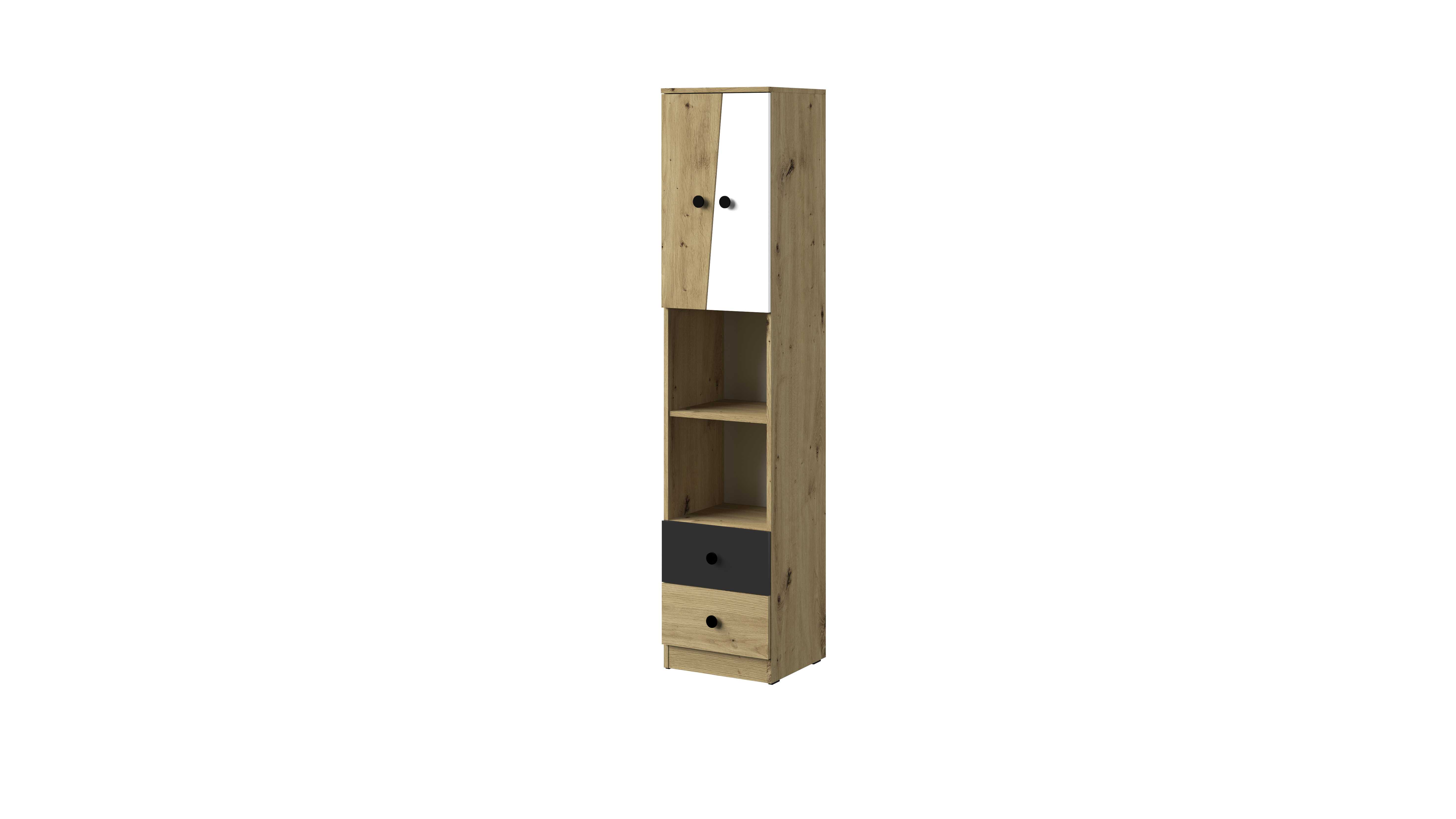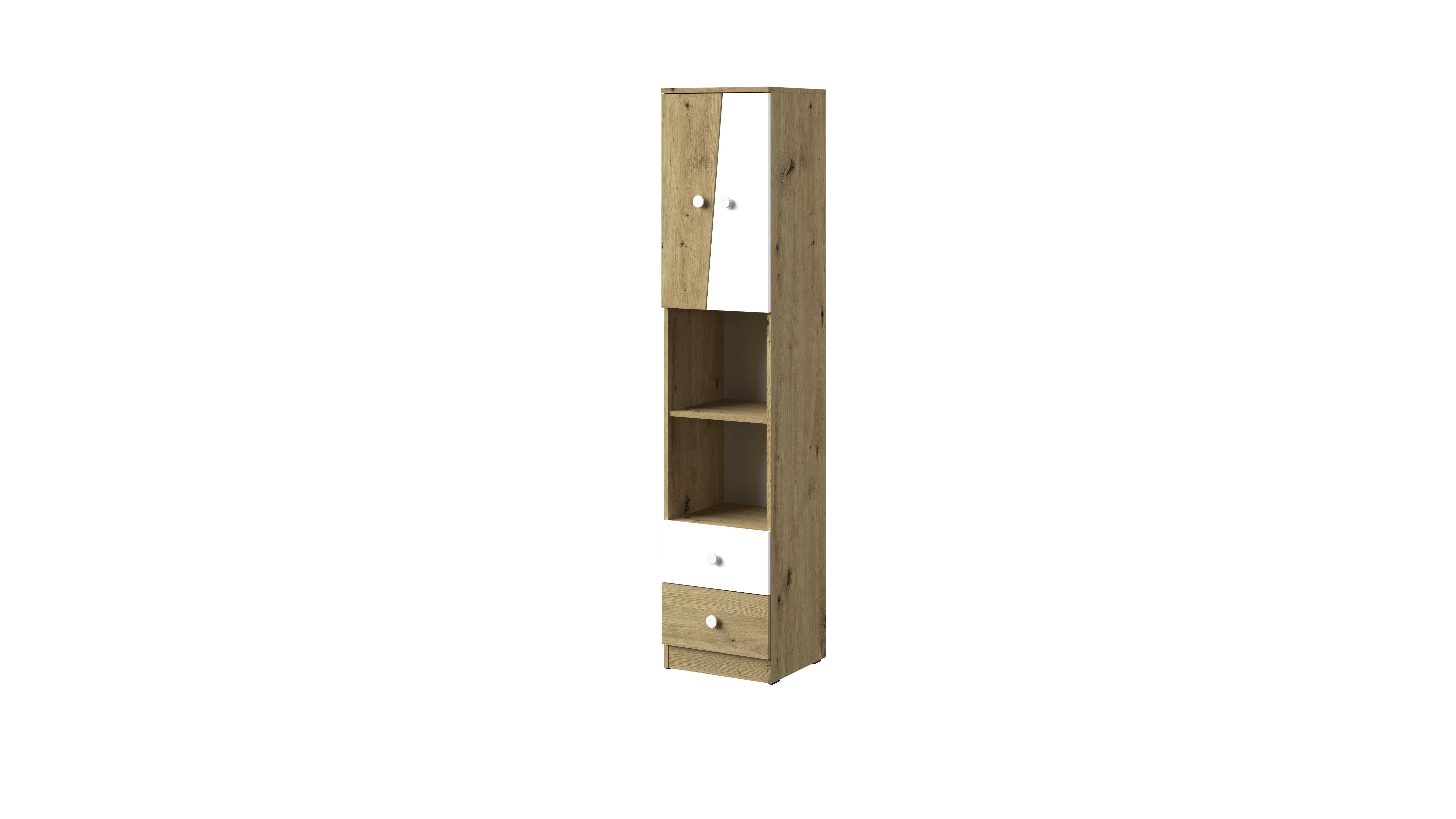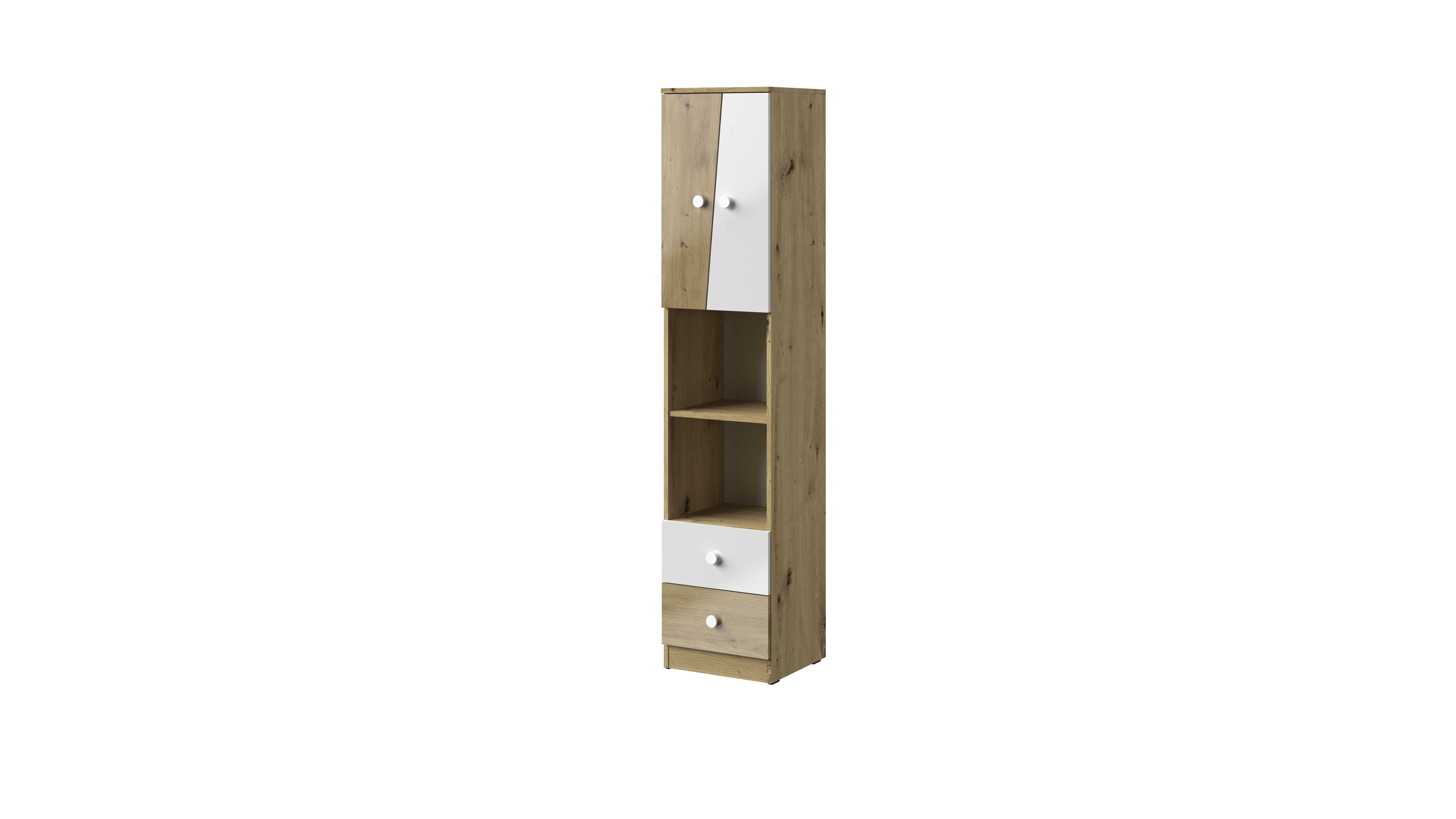 Knihovna 40 Neva 05 je úzký, elegantní regál s kombinací dřevěného a bílého dekoru. Je vybavený dvěma otevřenými policemi, jednou uzavřenou skříňkou a dvěma šuplíky, což nabízí praktické úložné prostory pro knihy a další doplňky. Svým kompaktním rozměrem je ideální do menších prostor, kde poskytne dostatek místa pro uskladnění a zároveň zútulní interiér.
