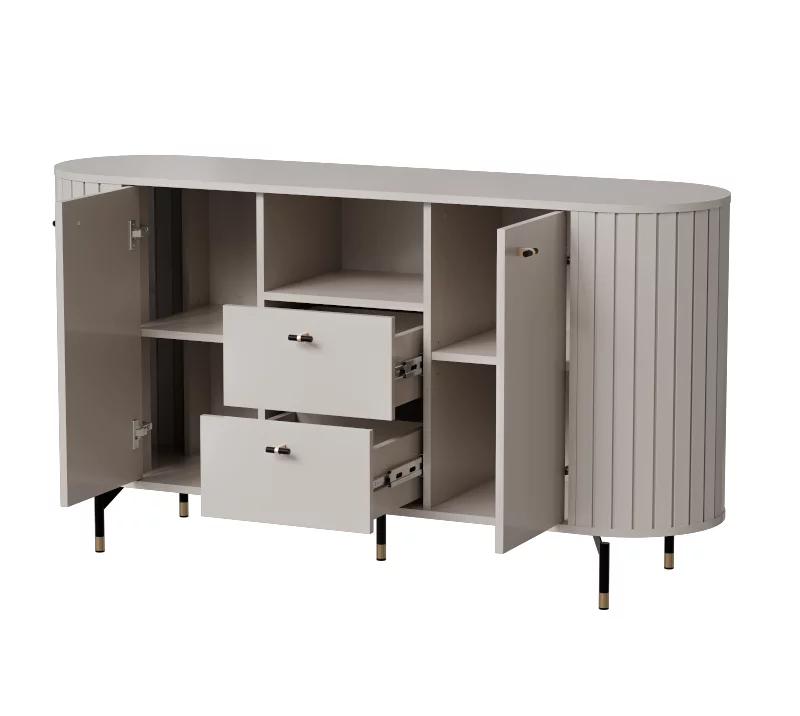 Sestava Zante se vyznačuje moderním designem a kvalitním zpracováním. Tloušťka použitých desek je 16 mm, s odolnými ABS hranami, které zajišťují dlouhou životnost. Elegantní kovové nožky a úchytky dodávají nábytku stylový vzhled. K dispozici jsou dvě barevné varianty – černý mat nebo jemný odstín kašmíru, které snadno zapadnou do různých interiérů. Sestava Zante je ideální volbou pro ty, kteří hledají nadčasovou eleganci a funkčnost pro svůj obývací pokoj nebo jídelnu.