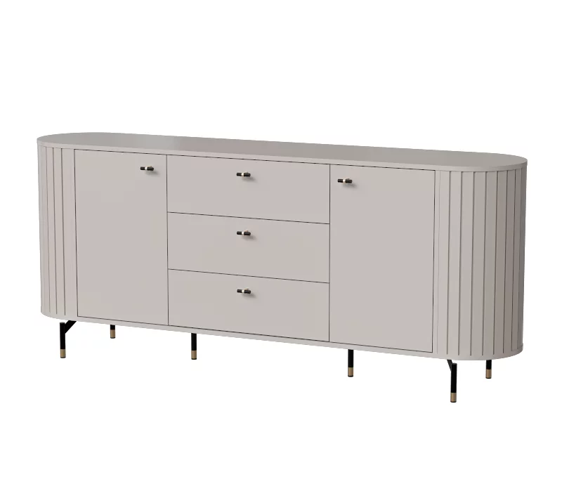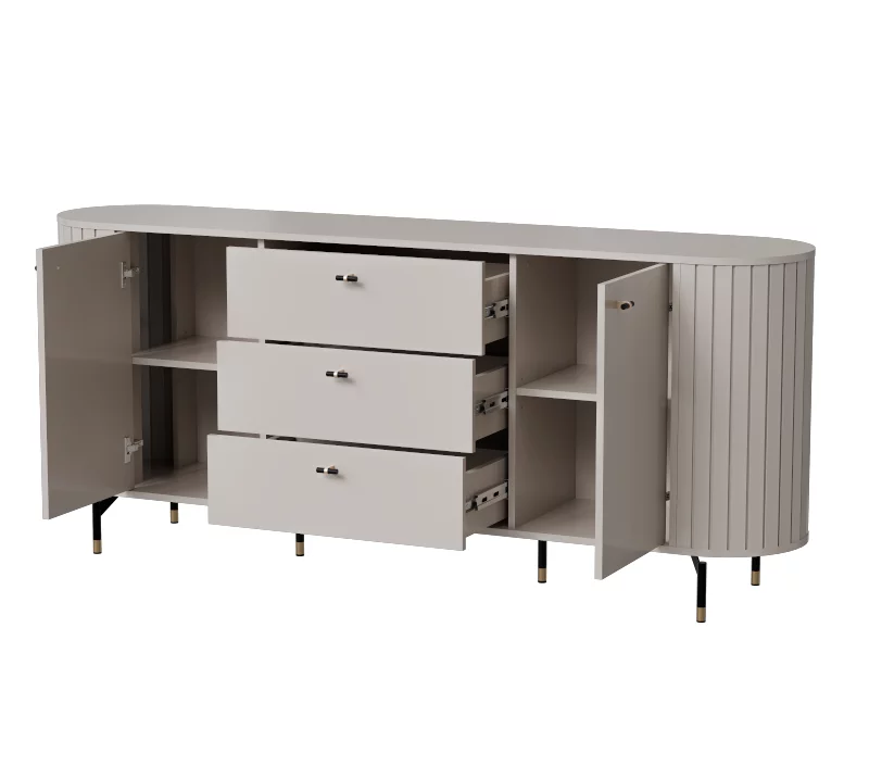 Sestava Zante se vyznačuje moderním designem a kvalitním zpracováním. Tloušťka použitých desek je 16 mm, s odolnými ABS hranami, které zajišťují dlouhou životnost. Elegantní kovové nožky a úchytky dodávají nábytku stylový vzhled. K dispozici jsou dvě barevné varianty – černý mat nebo jemný odstín kašmíru, které snadno zapadnou do různých interiérů. Sestava Zante je ideální volbou pro ty, kteří hledají nadčasovou eleganci a funkčnost pro svůj obývací pokoj nebo jídelnu.
