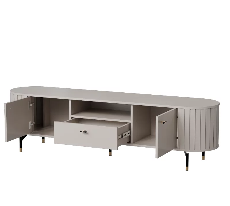 Sestava Zante se vyznačuje moderním designem a kvalitním zpracováním. Tloušťka použitých desek je 16 mm, s odolnými ABS hranami, které zajišťují dlouhou životnost. Elegantní kovové nožky a úchytky dodávají nábytku stylový vzhled. K dispozici jsou dvě barevné varianty – černý mat nebo jemný odstín kašmíru, které snadno zapadnou do různých interiérů. Sestava Zante je ideální volbou pro ty, kteří hledají nadčasovou eleganci a funkčnost pro svůj obývací pokoj nebo jídelnu.