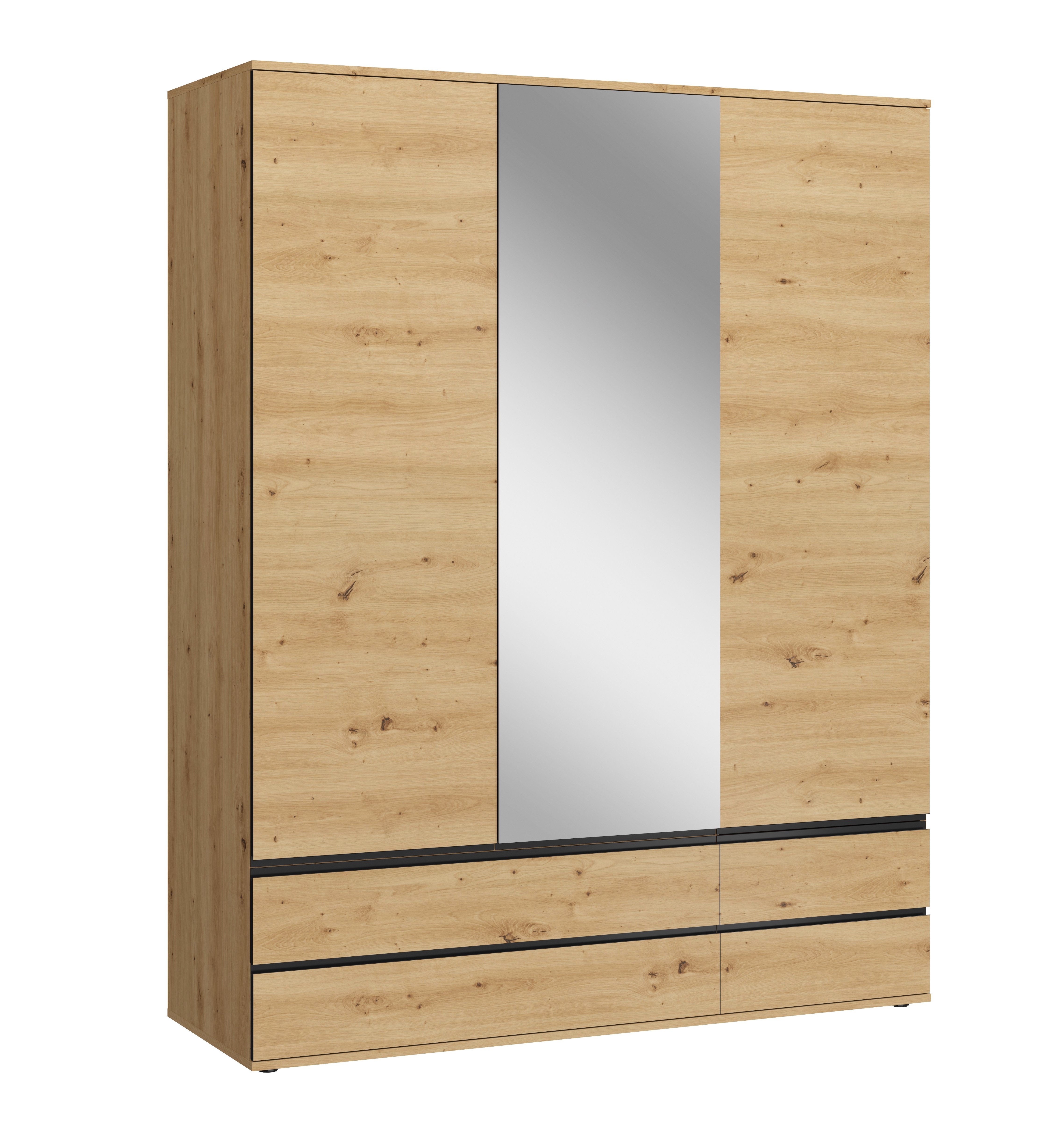 Šatní skříň NOXAL je moderní a prostorná skříň s elegantním zrcadlem uprostřed, která se perfektně hodí do každého interiéru. Vyrobena z kvalitních materiálů s přírodním dekorem, nabízí dostatek úložného prostoru díky několika policím a zásuvkám. Praktické řešení pro uspořádání oděvů i doplňků.