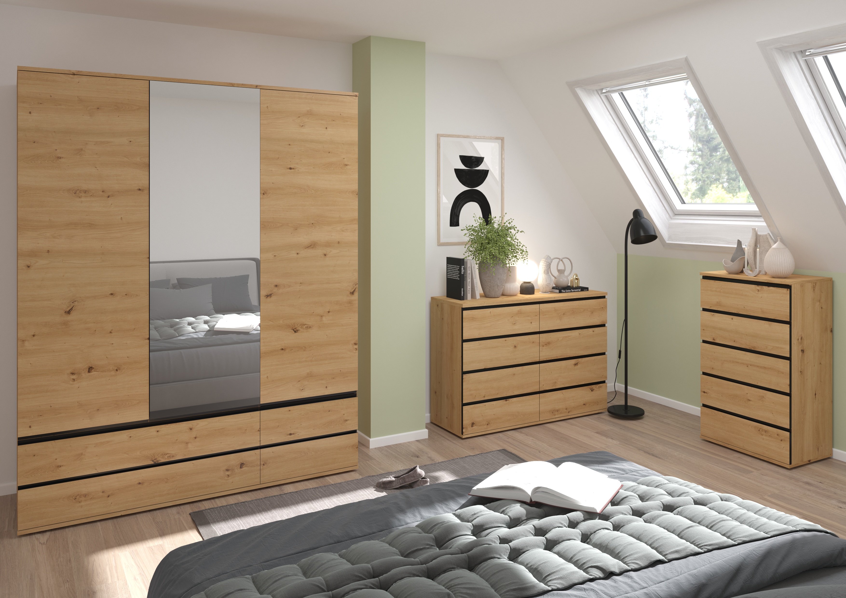 Sestava NOXAL přináší do interiéru přírodní eleganci spojenou s moderními prvky. Kombinace dekoru dřeva Dub Artisan s černými akcenty dodává nábytku nadčasový vzhled, který se hodí jak do obývacího pokoje, tak do ložnice. Každý kus nábytku je navržen tak, aby byl praktický a poskytoval dostatek úložného prostoru pro vaše věci. Série Noxal je ideální volbou pro ty, kteří hledají stylový a funkční nábytek, který harmonicky zapadne do různých typů interiérů.