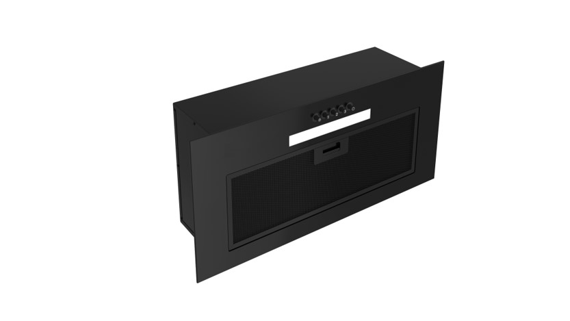 Černá barva, černý skleněný rám, výkon 610 m^3/h, velmi tichá (50 – 68 dB), energetická třída B, 3 stupně regulace ventilátoru, led pásek