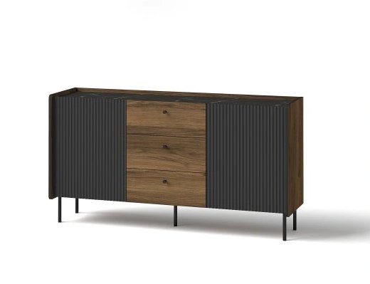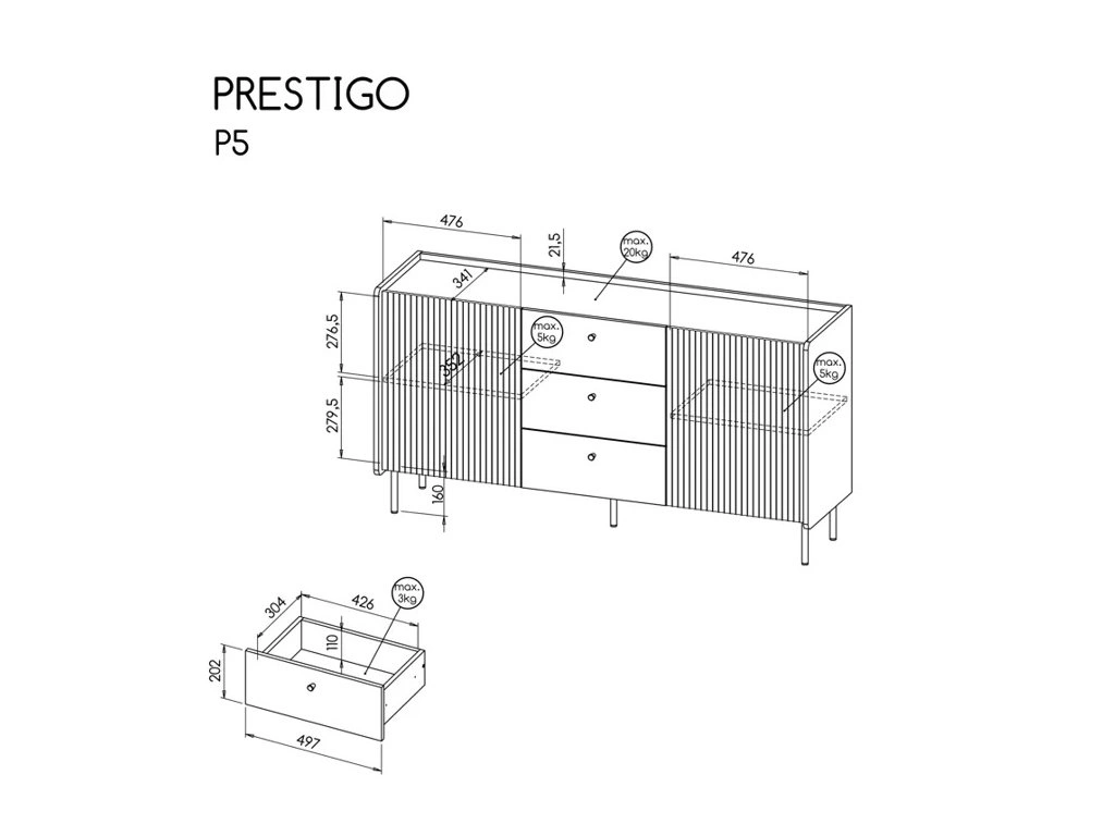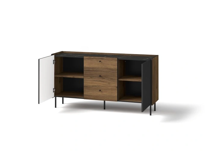 Prestigo P5 je stylová komoda, která nabízí praktický úložný prostor s kombinací otevřených polic a uzavřených skříněk. Moderní design v tmavém dřevě s černými detaily dodá interiéru eleganci a jedinečnost.