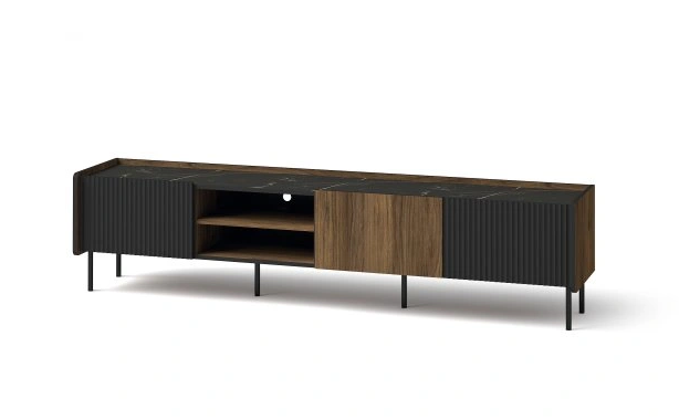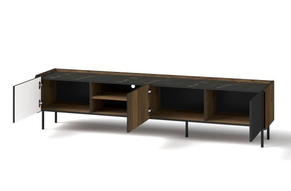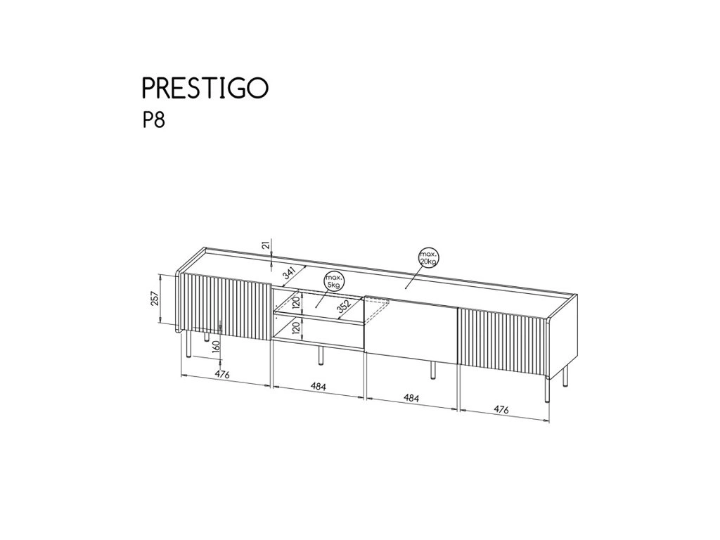 Prestigo P8 je stylová televizní komoda, která kombinuje moderní design s praktickým úložným prostorem. Disponuje několika uzavíratelnými skříňkami a otevřenou částí pro audio/video zařízení. Díky tmavému dekoru dřeva a černým kovovým nohám je ideálním doplňkem do moderních interiérů.