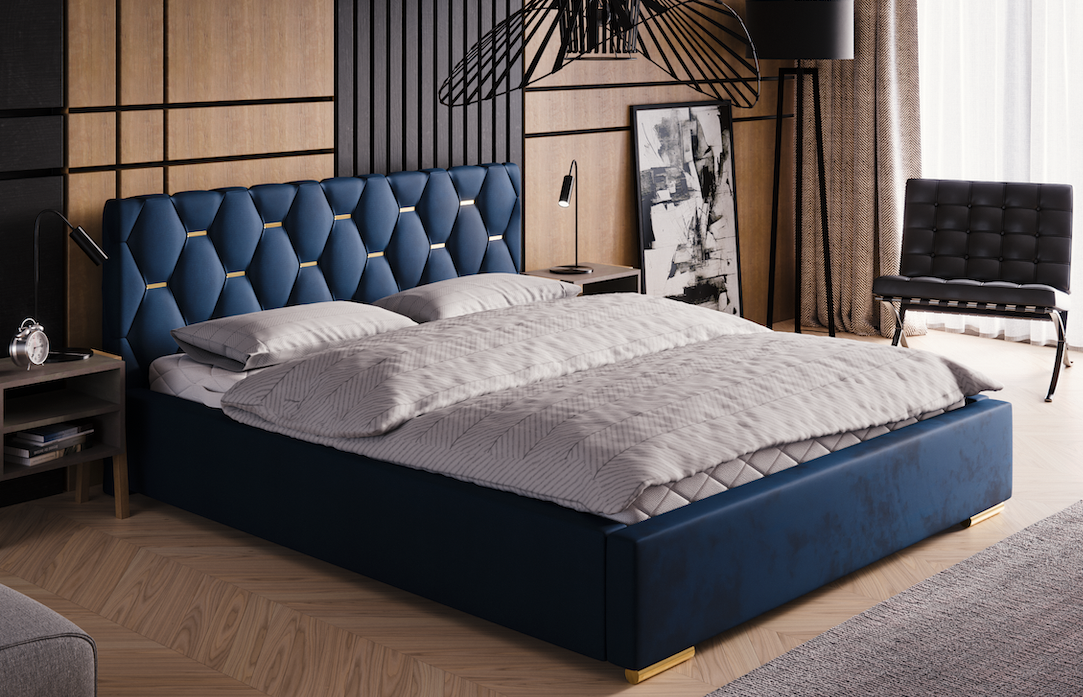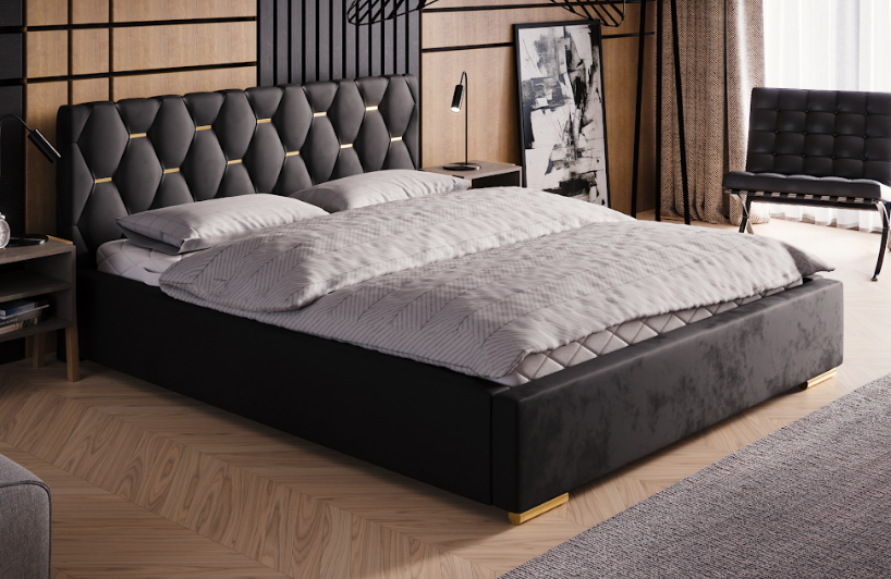 Čalouněná postel Verso je moderním a luxusním doplňkem do vaší ložnice. Na první pohled upoutá vysokým čelem s elegantním prošíváním a zlatými detaily, které dodávají sofistikovaný vzhled. Je vyrobena z kvalitních materiálů, což zajišťuje dlouhou životnost a vysoký komfort. Pod roštem, který lze volit ve variantách s různým počtem lamel, se nachází velký úložný prostor, otevíraný pomocí plynových pístů. Dno úložného prostoru je z pevné HDF desky, což zaručuje odolnost proti prohnutí a snadnou manipulaci při úklidu. Design i funkčnost této postele splní nároky i těch nejnáročnějších zákazníků.