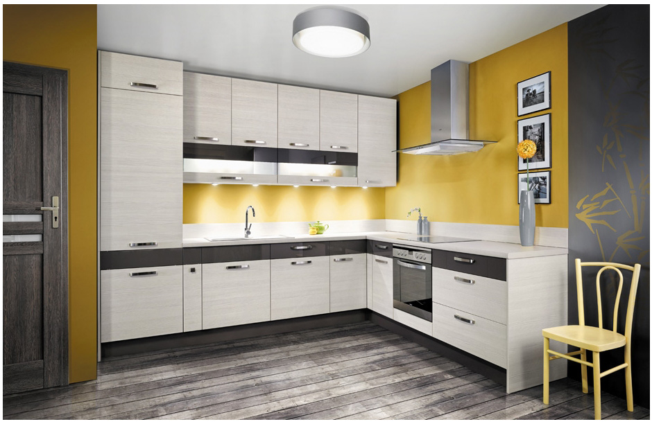 Skříňky se dodávají v demontu a můžete je seřadit libovolně, nemusíte se držet pořadí na fotografii. Pokud vám složení sestavy nevyhovuje, můžete si poskládat vlastní kuchyni na míru z horních a dolních skříněk.