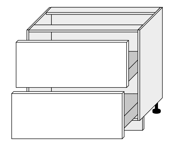 Korpusy skříněk jsou vyrobené z kvalitní LTD desky o tloušťce 18 mm ( s ABS 0,5 mm). Záda jsou z bílého sololitu a vnitřní police mají nosnost 15-25 kg. Kování BLUM nebo Hettich s doživotní zárukou (úchytky, kování a sokly jsou v ceně) a všechna dvířka i zásuvky disponují systémem tlumeného dovírání (kromě zásuvek Blum METABOX). Skříňky stojí na nastavitelných nožkách o výšce 10 nebo 15 cm.