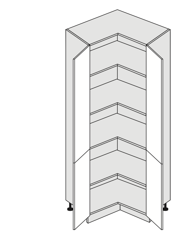 Korpusy skříněk jsou vyrobené z kvalitní LTD desky o tloušťce 18 mm ( s ABS 0,5 mm). Záda jsou z bílého sololitu a vnitřní police mají nosnost 15-25 kg. Kování BLUM nebo Hettich s doživotní zárukou (úchytky, kování a sokly jsou v ceně) a všechna dvířka i zásuvky disponují systémem tlumeného dovírání (kromě zásuvek Blum METABOX). Skříňky stojí na nastavitelných nožkách o výšce 10 nebo 15 cm.
