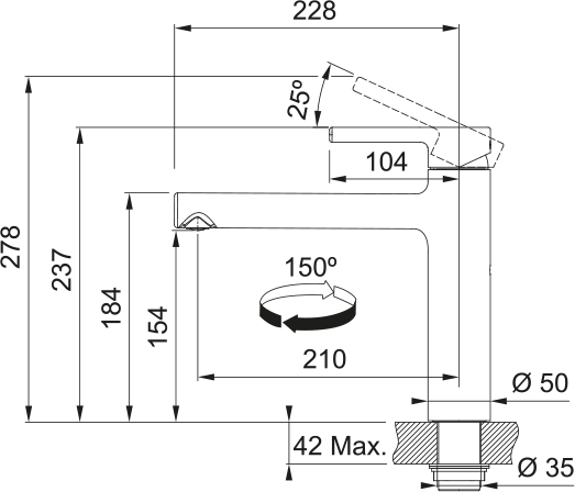 Otočná 150°. Připojení Hadičky 45 cm. Průtok vody 12 l/min. (3 bar). Laminární průtok vody. Technologie pro úsporu vody.