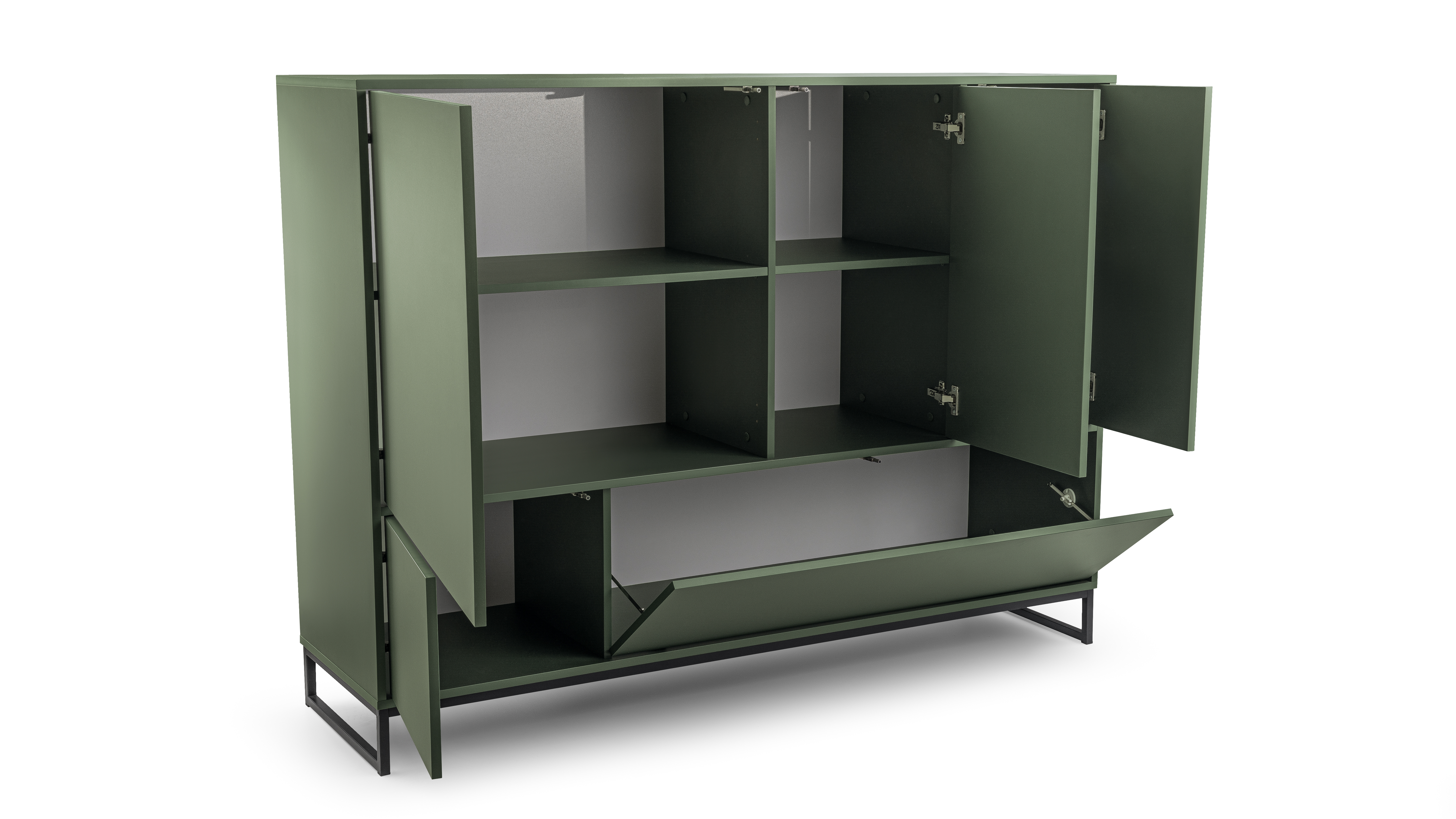 Komoda GENUA je elegantní a prostorný úložný nábytek, který se skvěle hodí do moderních interiérů. Nabízí dostatek místa díky kombinaci skříněk a výklopných přihrádek, které umožňují praktickou organizaci věcí. Minimalistický design doplněný kovovým podnožím dodává komodě lehkost a stabilitu. Dostupná ve více barevných variantách, snadno se přizpůsobí různým stylům interiéru.