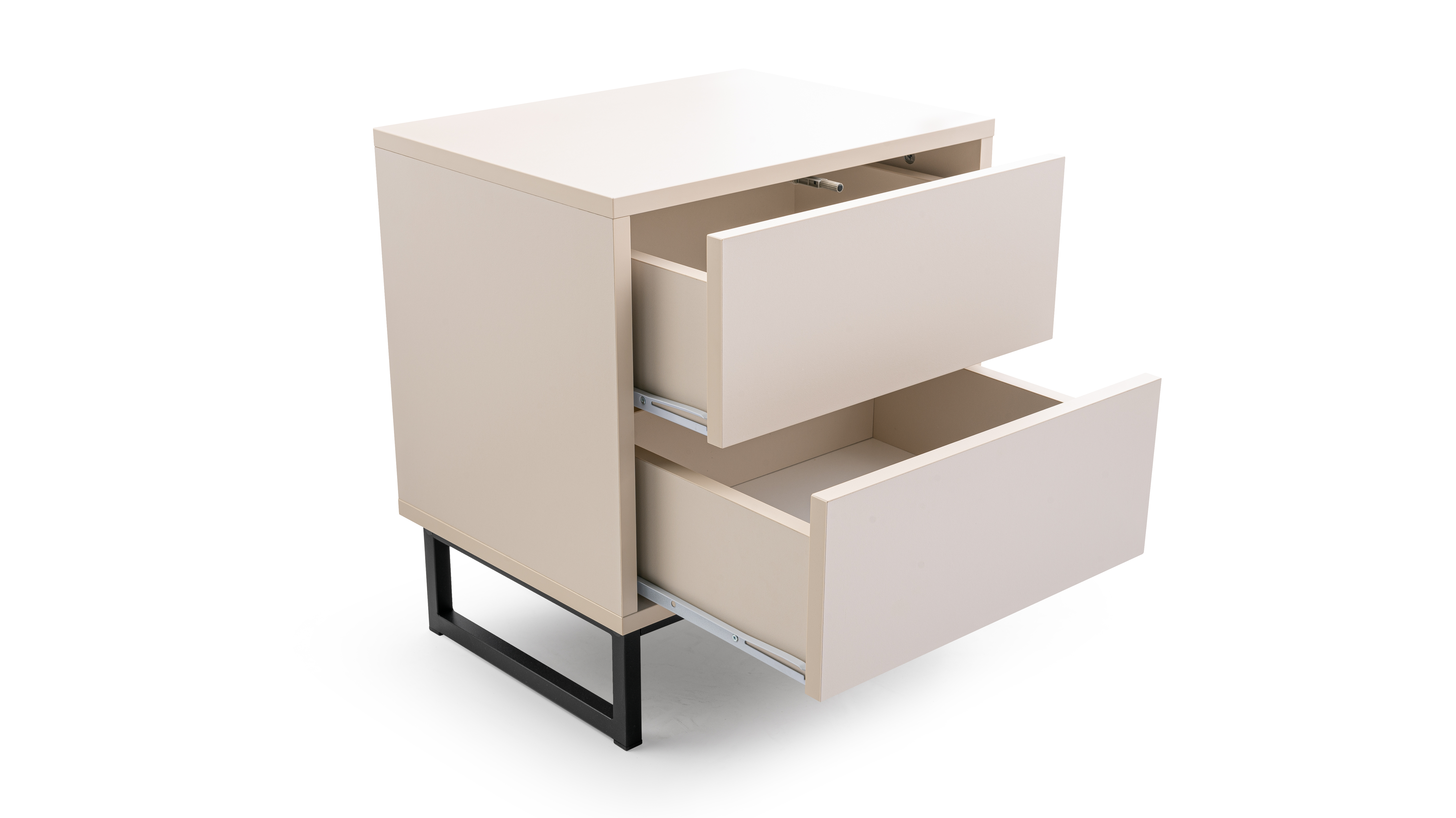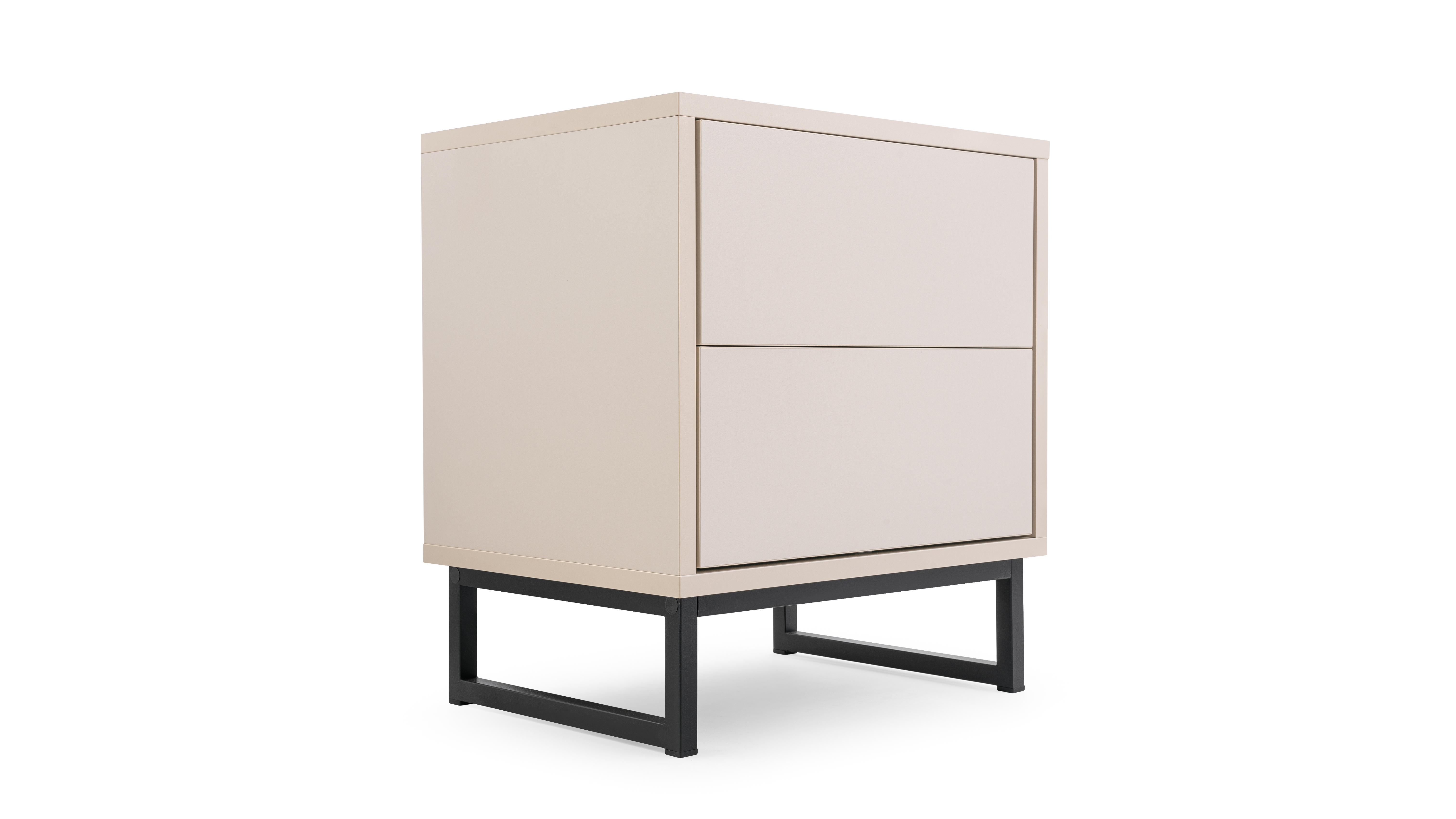 Noční stolek Genua je minimalistický noční stolek s čistými liniemi a dvěma prostornými zásuvkami pro uložení všeho potřebného. Elegantní design doplňuje černá kovová podnož, která dodává lehkost a moderní vzhled.