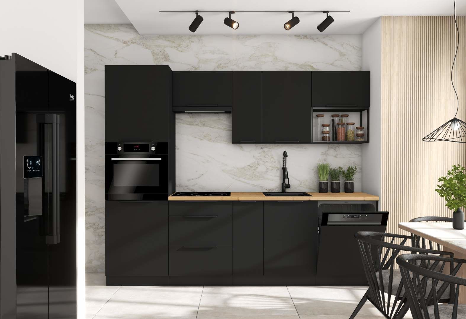 K této kuchyňské lince by se vám mohl líbit granitový dřez s baterií, který bude ladit s celkovým vzhledem kuchyně.