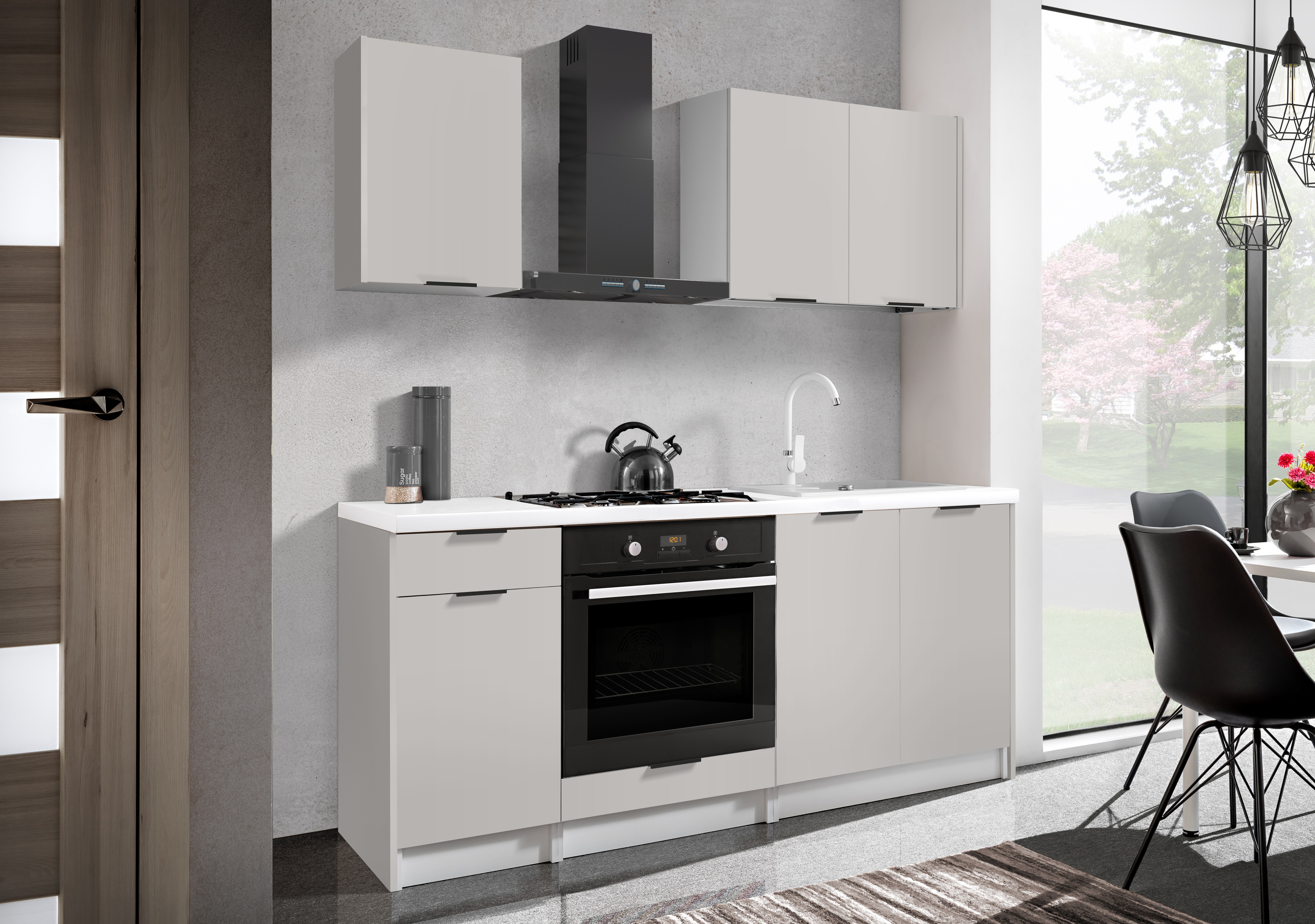 Skříňky se dodávají v demontu a můžete je seřadit libovolně, nemusíte se držet pořadí na fotografii. Pokud vám složení sestavy nevyhovuje, můžete si poskládat vlastní kuchyni na míru z horních a dolních skříněk. Spotřebiče a ukončovací boky nejsou v ceně.