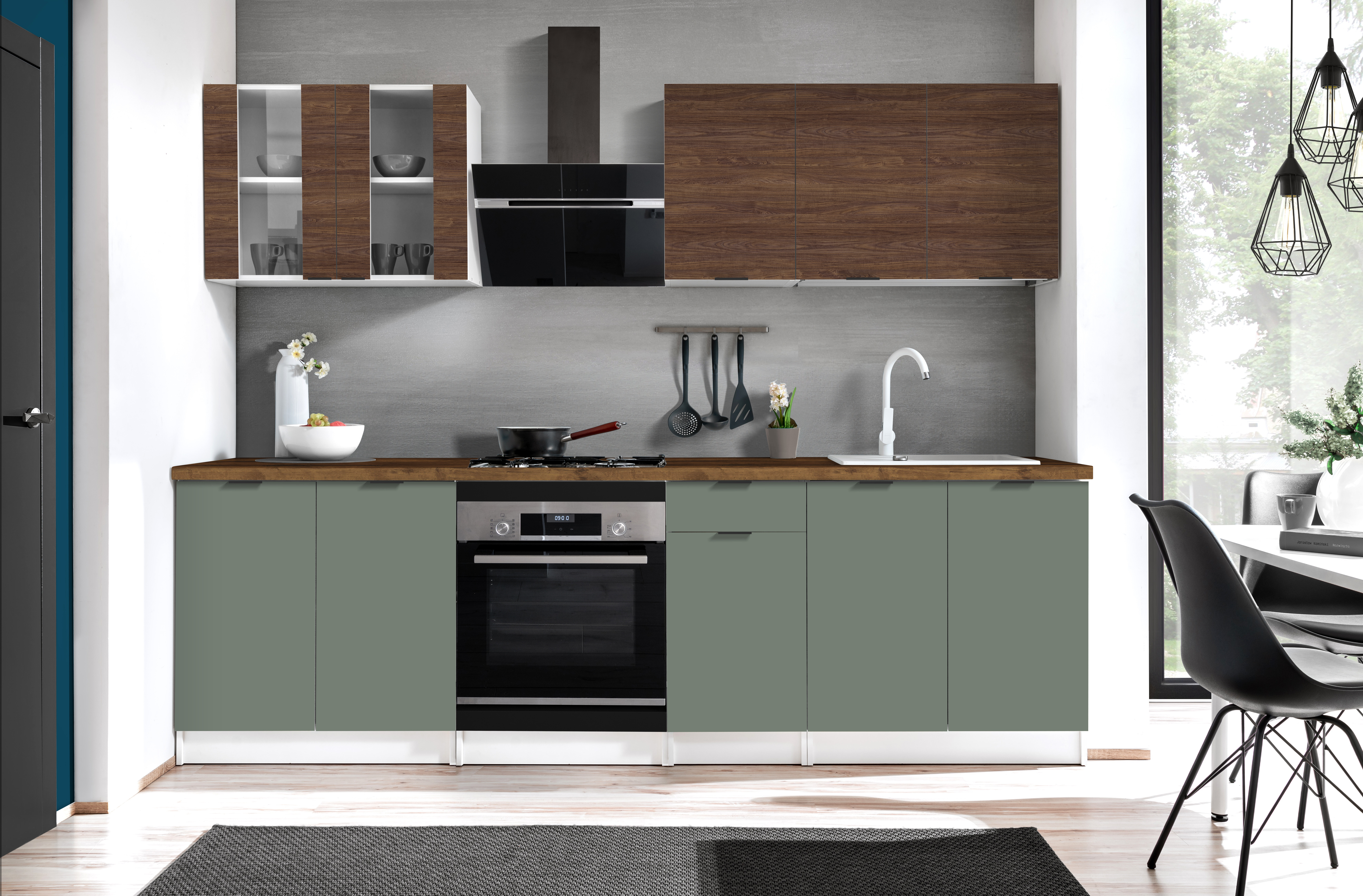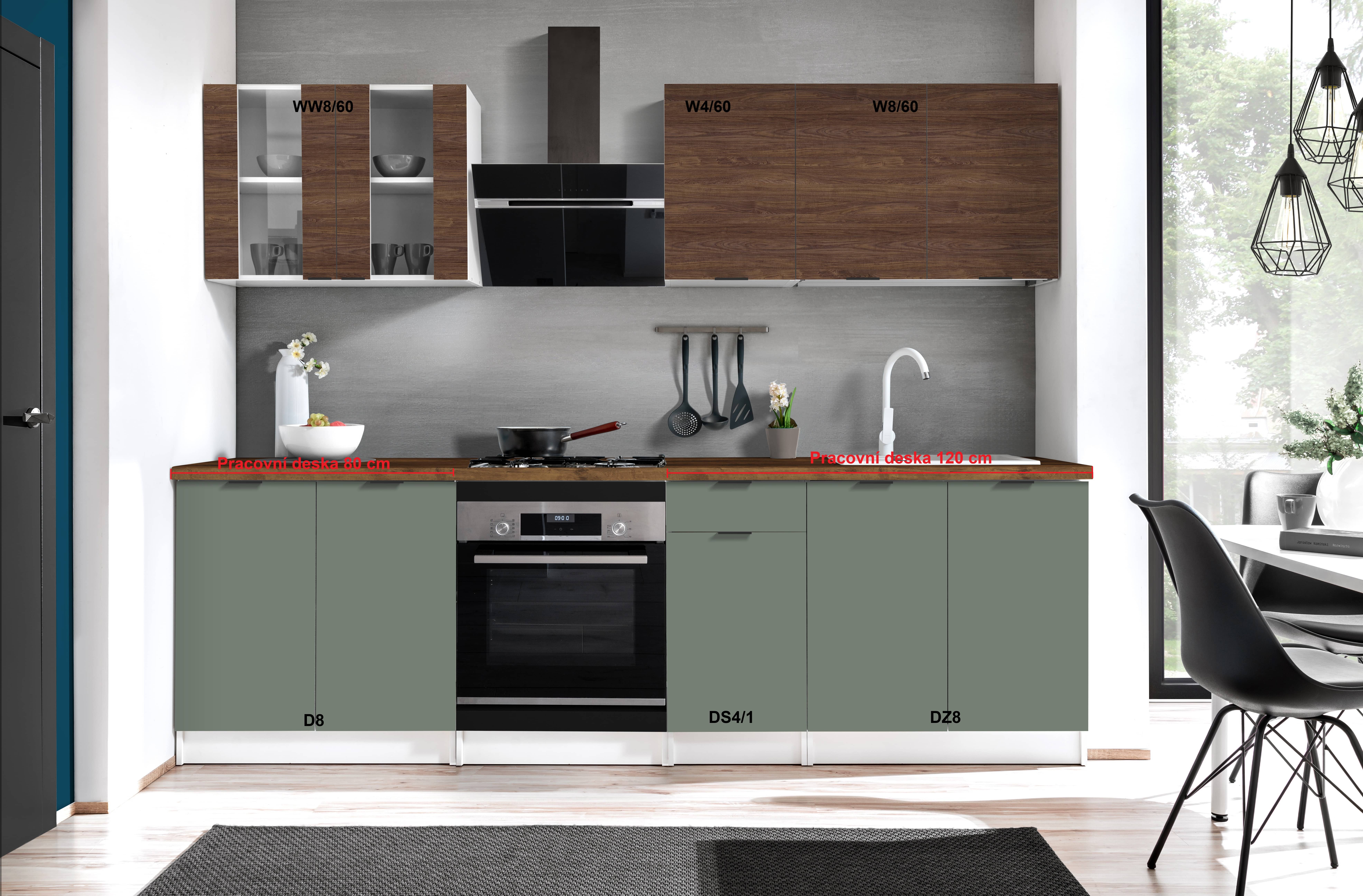 Skříňky se dodávají v demontu a můžete je seřadit libovolně, nemusíte se držet pořadí na fotografii. Pokud vám složení sestavy nevyhovuje, můžete si poskládat vlastní kuchyni na míru z horních a dolních skříněk. Spotřebiče a ukončovací boky nejsou v ceně.