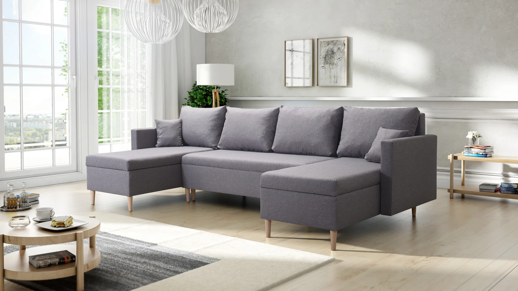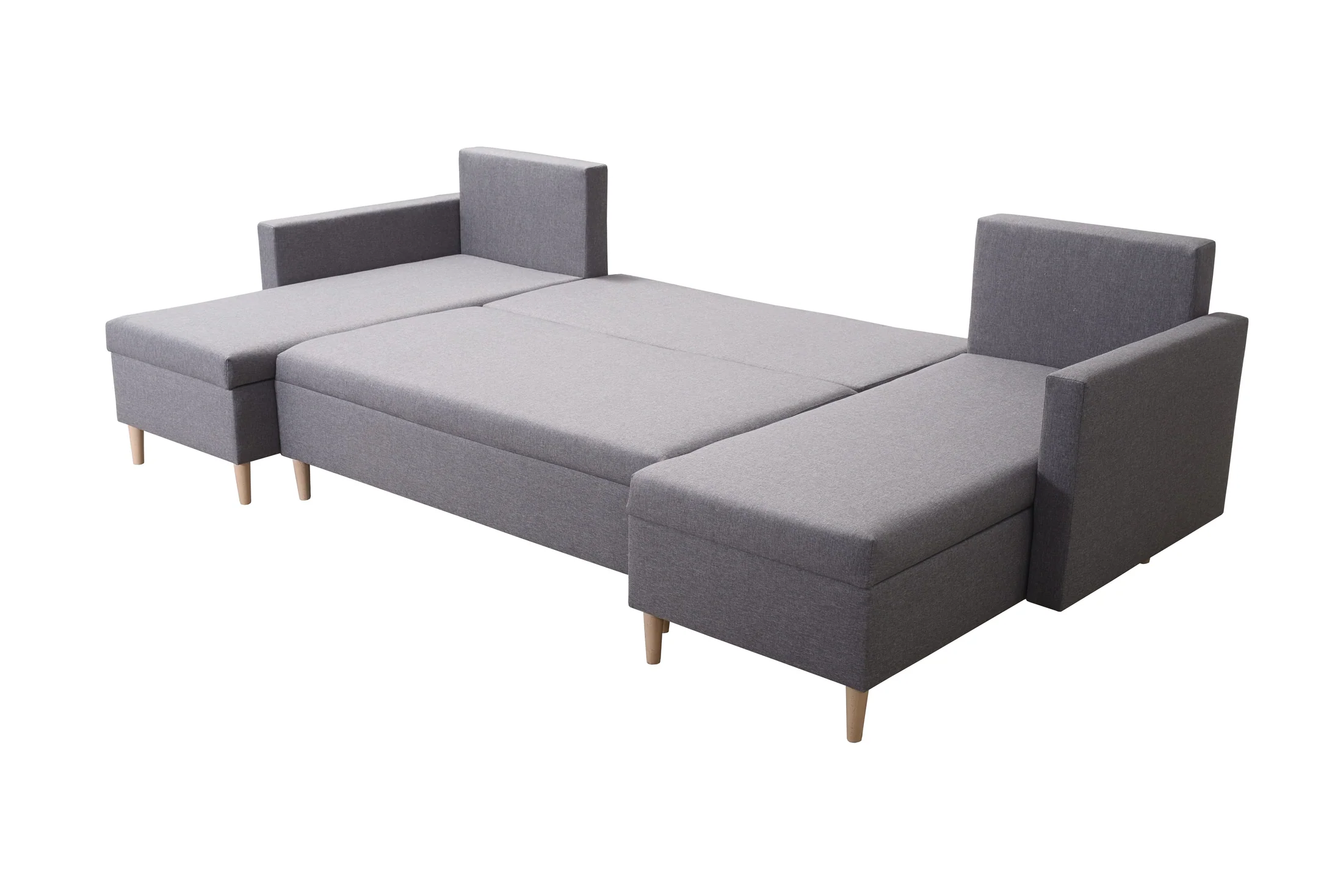Rohová sedací souprava Scandi U v elegantním skandinávském stylu je ideální volbou pro moderní interiéry. Nabízí komfortní posezení pro celou rodinu, možnost rozložení na lůžko a velkorysý úložný prostor pod každou částí. Součástí jsou pohodlné zádové a dekorační polštáře. Dřevěné nohy podtrhují celkový lehký vzhled.