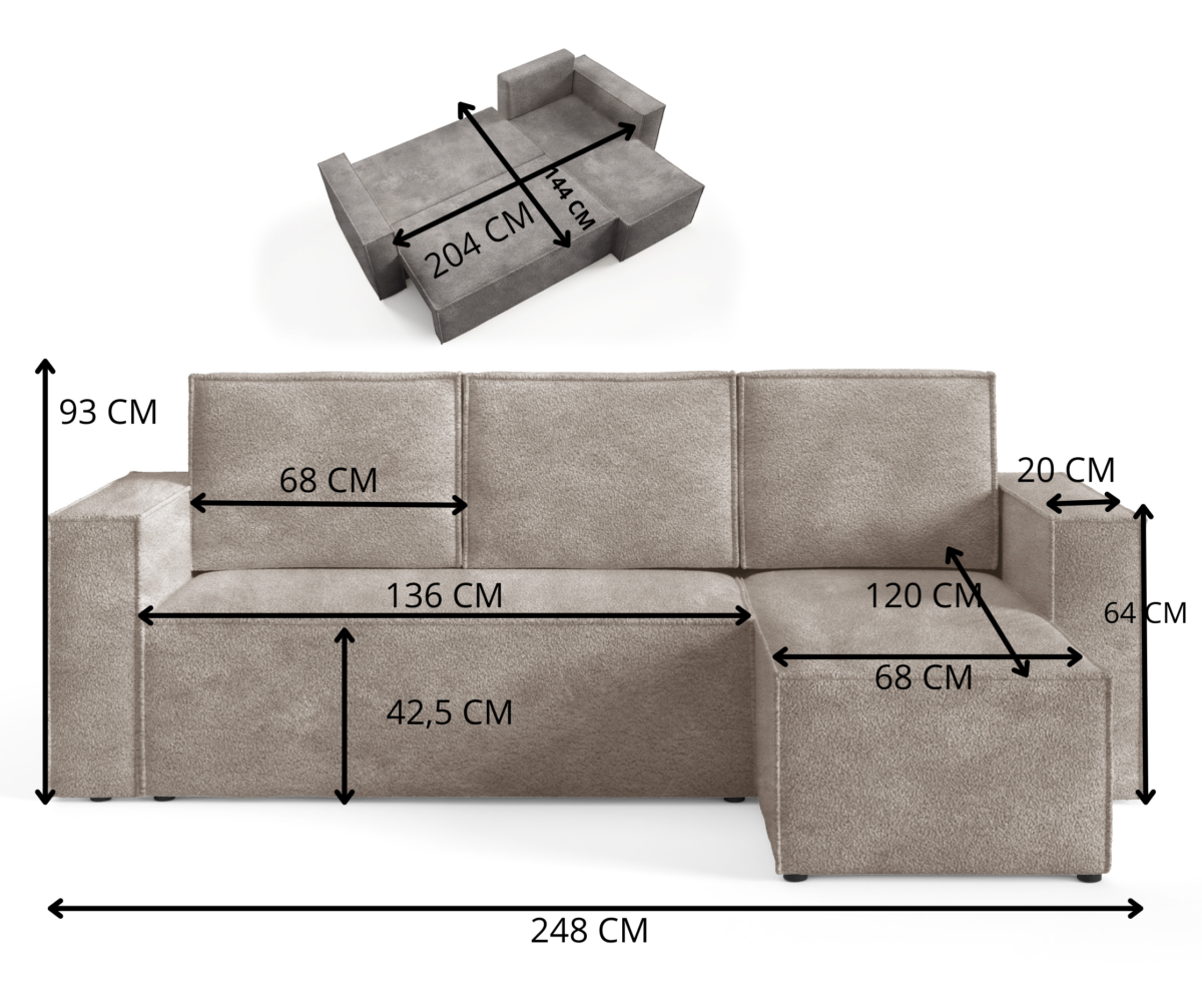 Hloubka sedáku k polštáři: 52 cm, Výška sedáku: 42,5 cm, Plocha na spaní: 204 x 144 cm