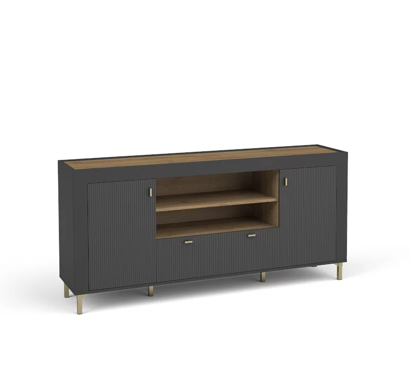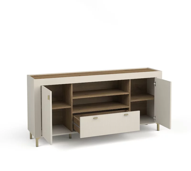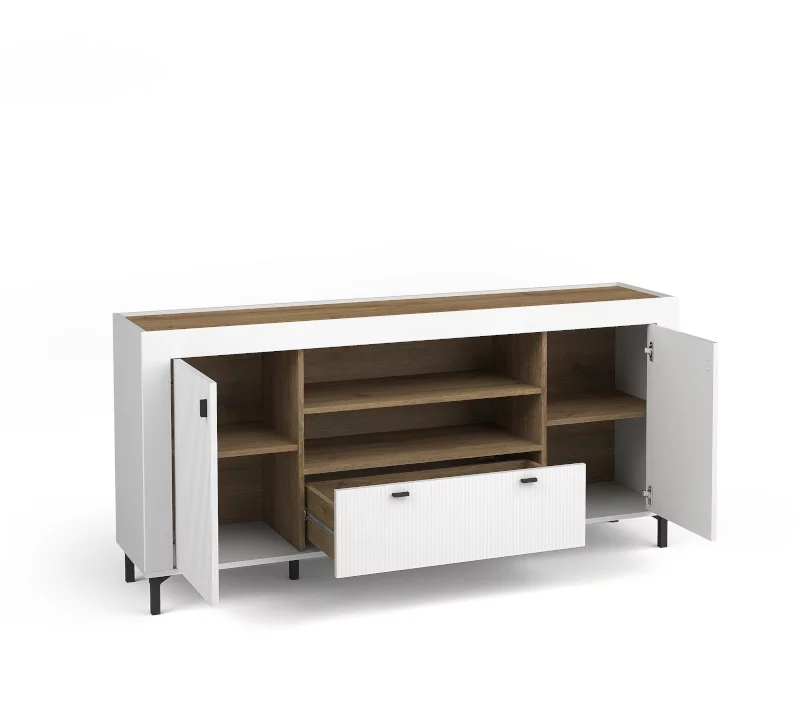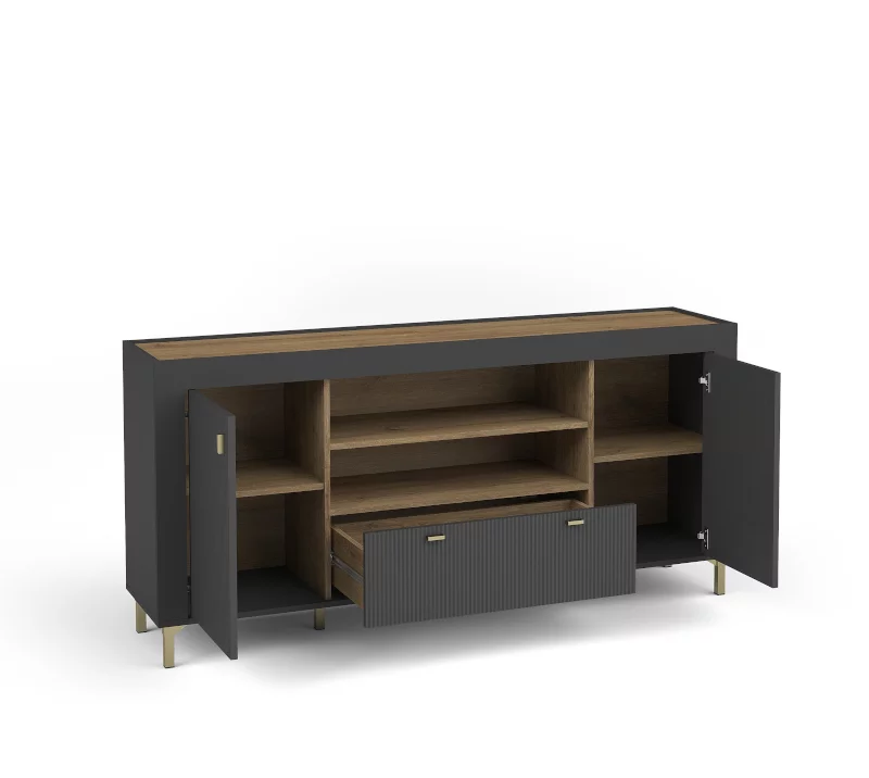Komoda Mossa MO7 disponuje dvěma skrytými policemi a třemi zásuvkami pro uložení všeho, co právě potřebujete po ruce.