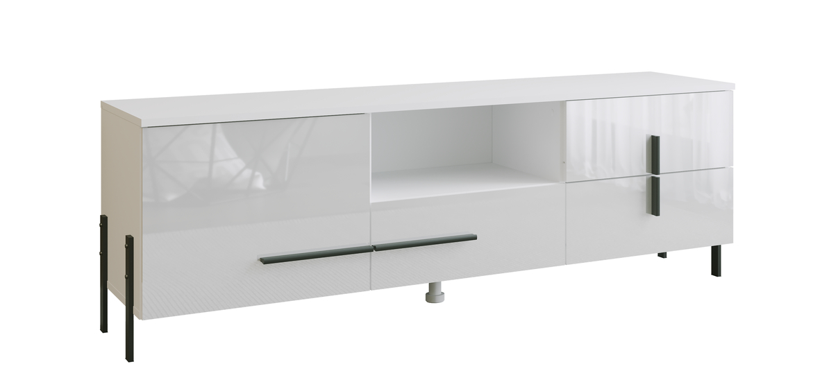Navíc využití kontrastních prvků, jako jsou kovové nohy a černé úchyty, dodává nábytku výjimečný a moderní vzhled, který dokonale odpovídá současným interiérovým trendům.
