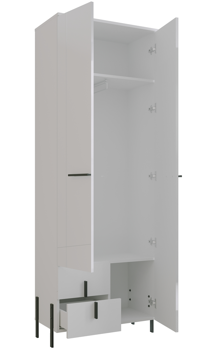 Navíc využití kontrastních prvků, jako jsou kovové nohy a černé úchyty, dodává nábytku výjimečný a moderní vzhled, který dokonale odpovídá současným interiérovým trendům.