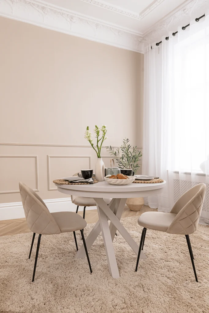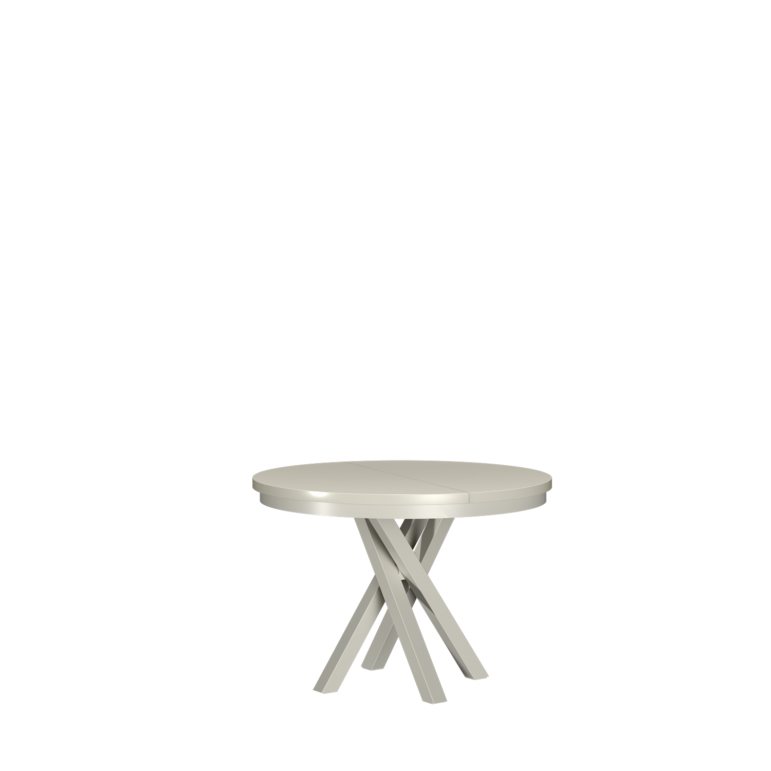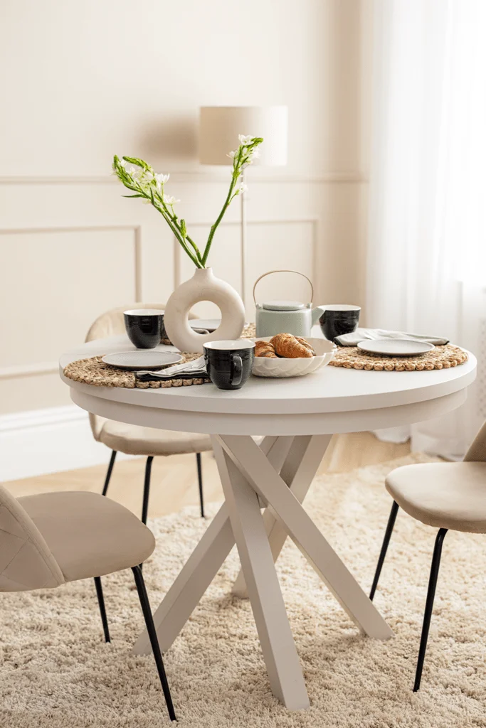 Rozkládací kulatý stůl MALMI spojuje moderní eleganci s praktickou funkčností. Pevná konstrukce a zkřížené nohy zajišťují stabilitu, zatímco minimalistické barevné provedení snadno zapadne do různých interiérů. Odolné materiály garantují dlouhou životnost a kulatý tvar vytváří příjemný prostor pro společné stolování. Ideální do jídelny, obývacího pokoje i kuchyně.
