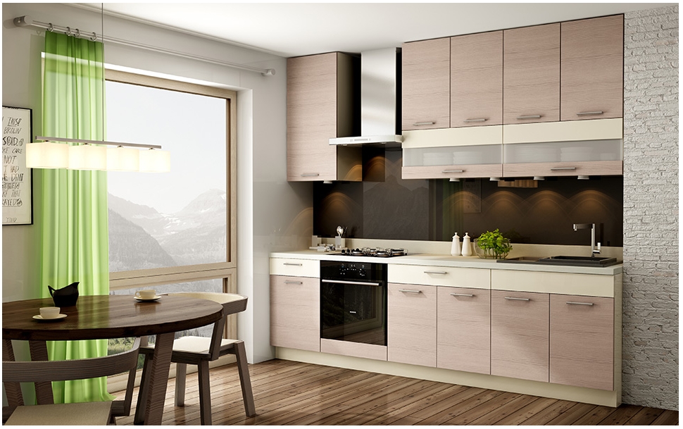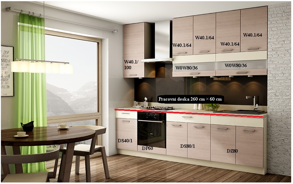 Skříňky se dodávají v demontu a můžete je seřadit libovolně, nemusíte se držet pořadí na fotografii. Pokud vám složení sestavy nevyhovuje, můžete si poskládat vlastní kuchyni na míru z horních a dolních skříněk.