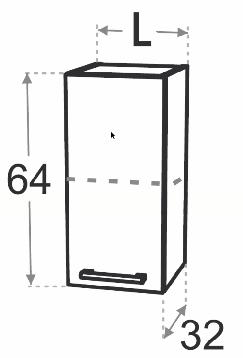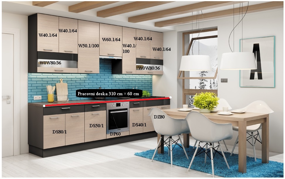 - Hloubka skříněk vč. dvířek: Horní - 32 cm - 60 cm, Dolní - 52 cm