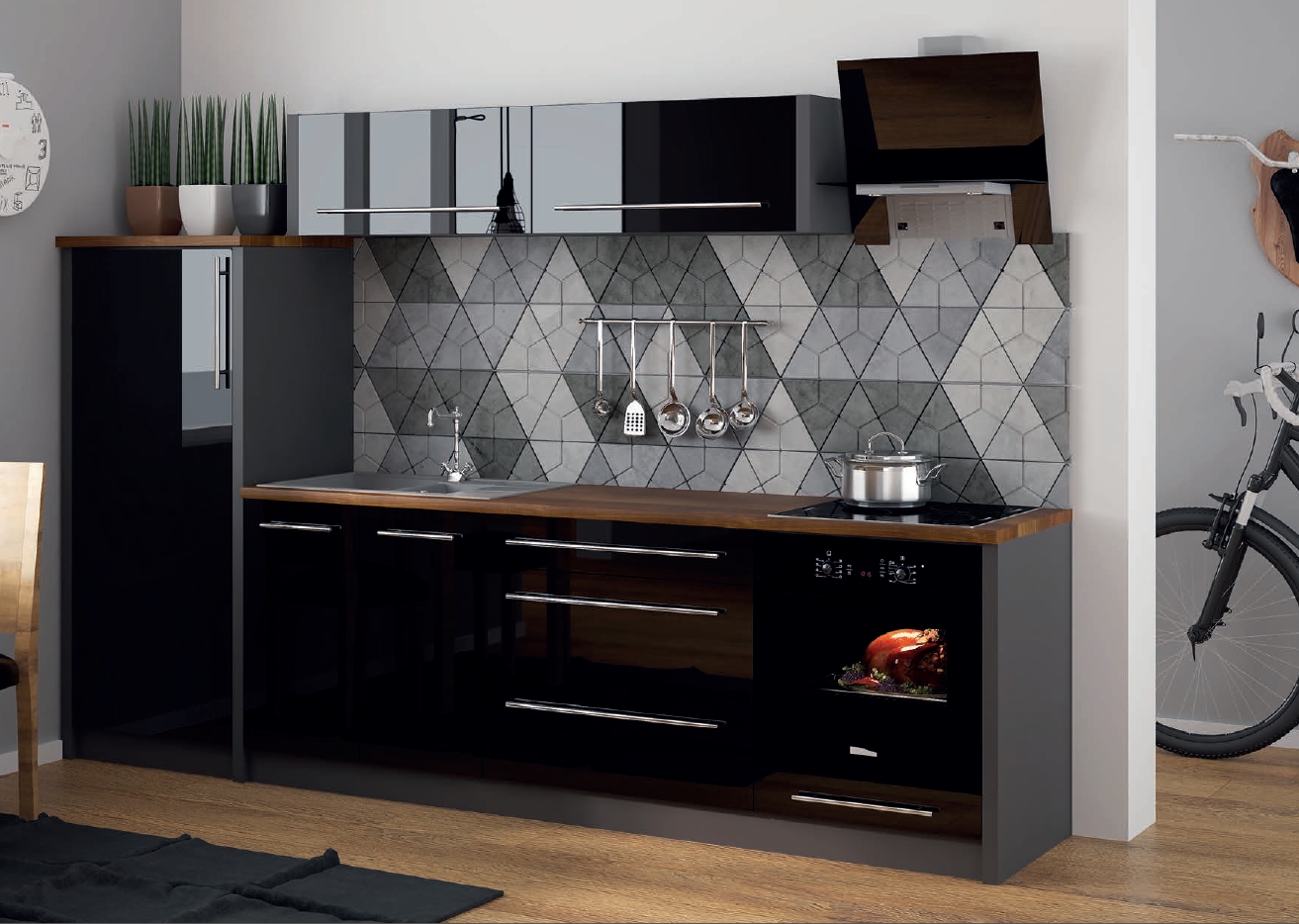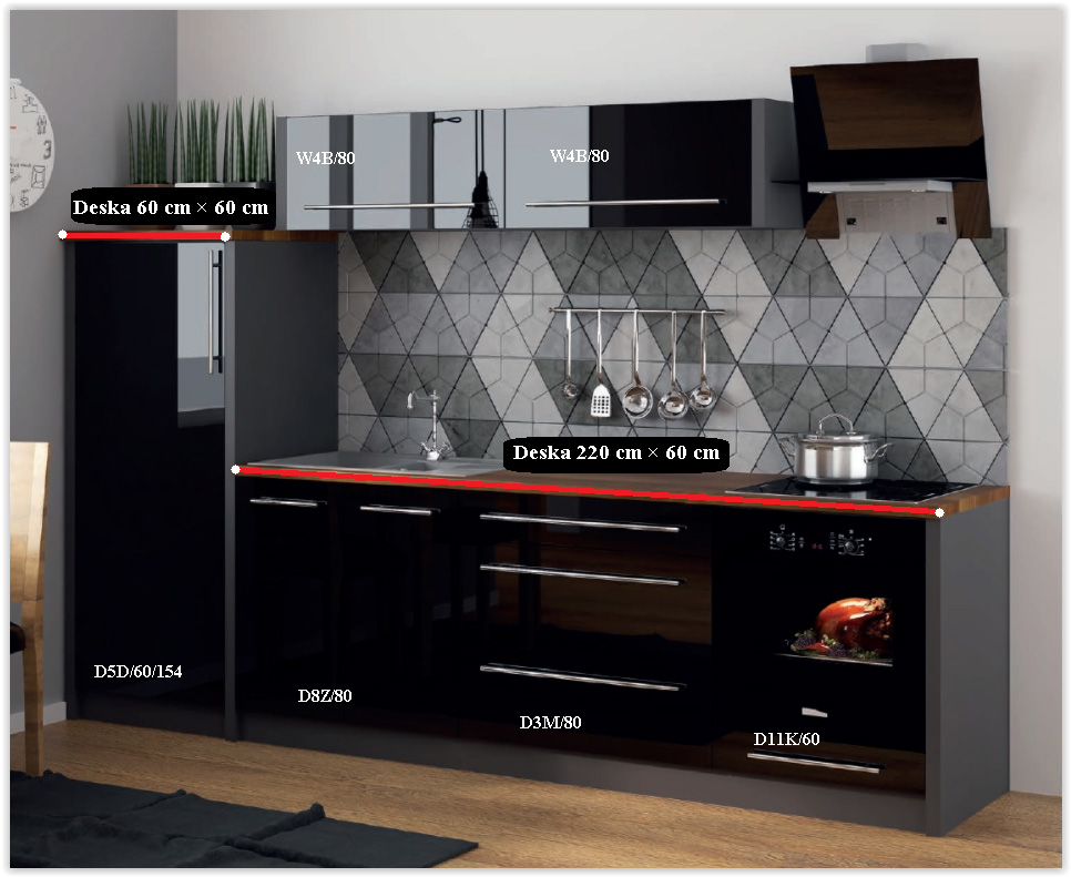 Skříňky se dodávají v demontu a můžete je seřadit libovolně, nemusíte se držet pořadí na fotografii. Pokud vám složení sestavy nevyhovuje, můžete si poskládat vlastní kuchyni na míru z horních a dolních skříněk.