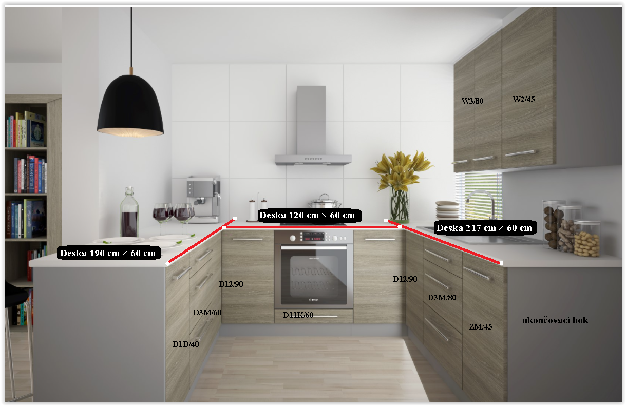 Skříňky se dodávají v demontu a můžete je seřadit libovolně, nemusíte se držet pořadí na fotografii. Pokud vám složení sestavy nevyhovuje, můžete si poskládat vlastní kuchyni na míru z horních a dolních skříněk.