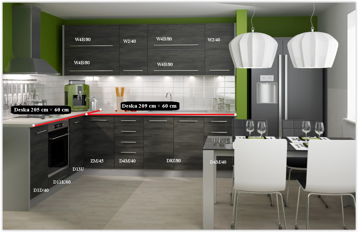 Skříňky se dodávají v demontu a můžete je seřadit libovolně, nemusíte se držet pořadí na fotografii. Pokud vám složení sestavy nevyhovuje, můžete si poskládat vlastní kuchyni na míru z horních a dolních skříněk.