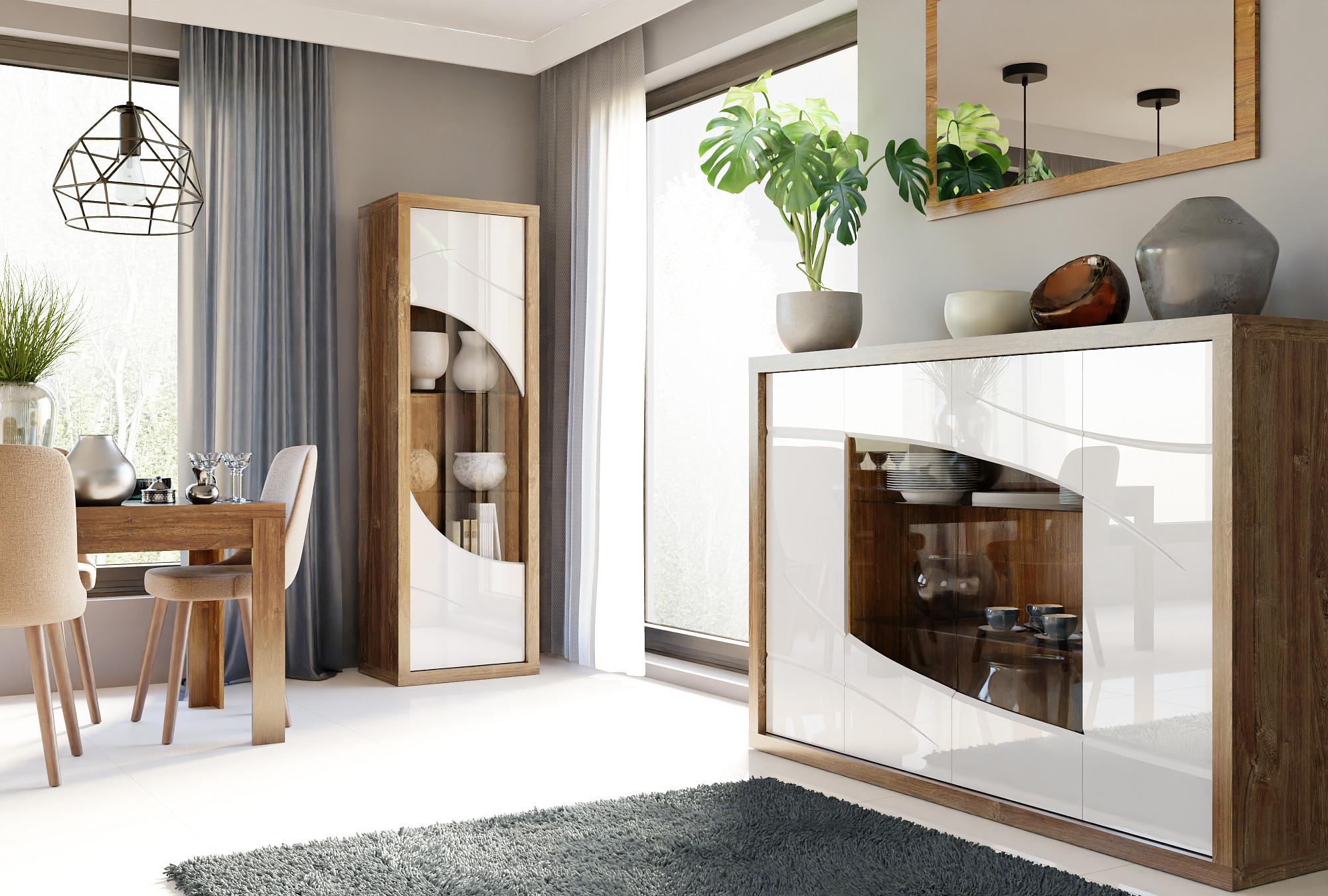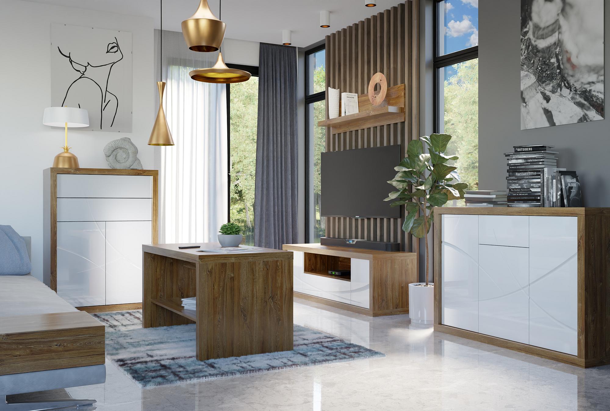 Pro moderní nábytek Paris je typická kombinace dekoru dřeva a bílých lesklých dvířek s vyfrézovanými liniemi. Díky tomu působí celá série originálně, s lehkým futuristickým nádechem. Pokud pro ni zvolíte i LED osvětlení, podtrhnete její nevšední design. Vybírejte policové skříně, konferenční stolky i zrcadlo do předsíně. Dvířka se otevírají systémem push to open, takže nepotřebujete žádné úchytky.
