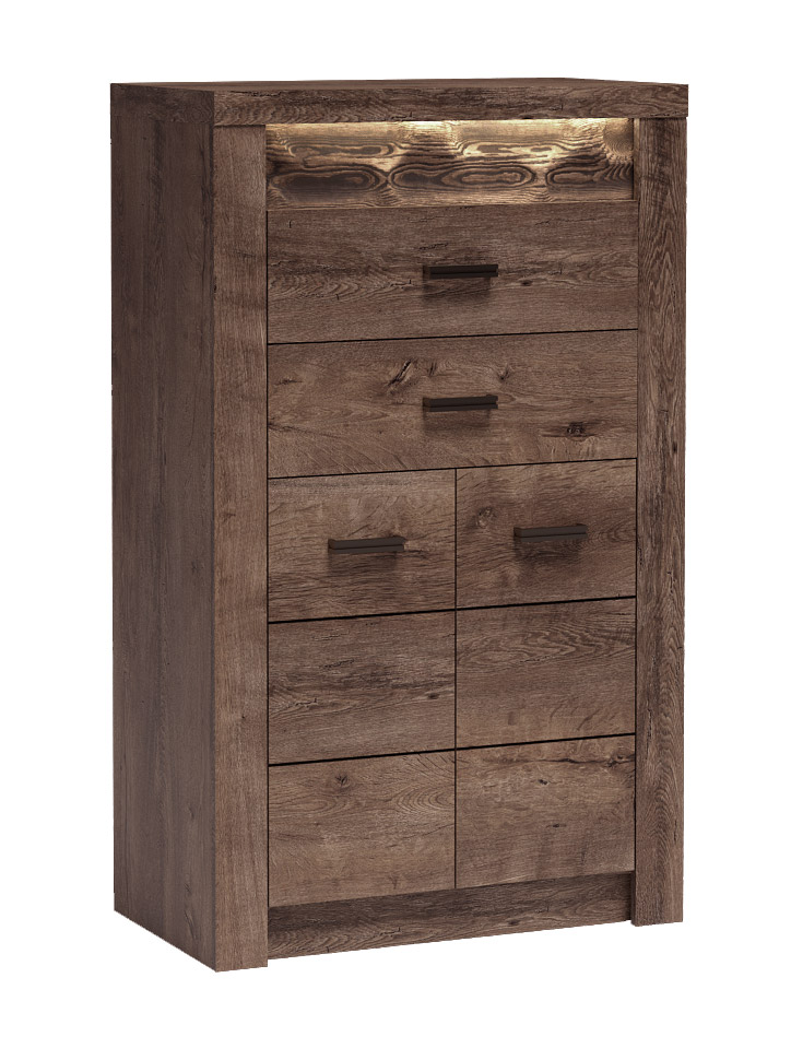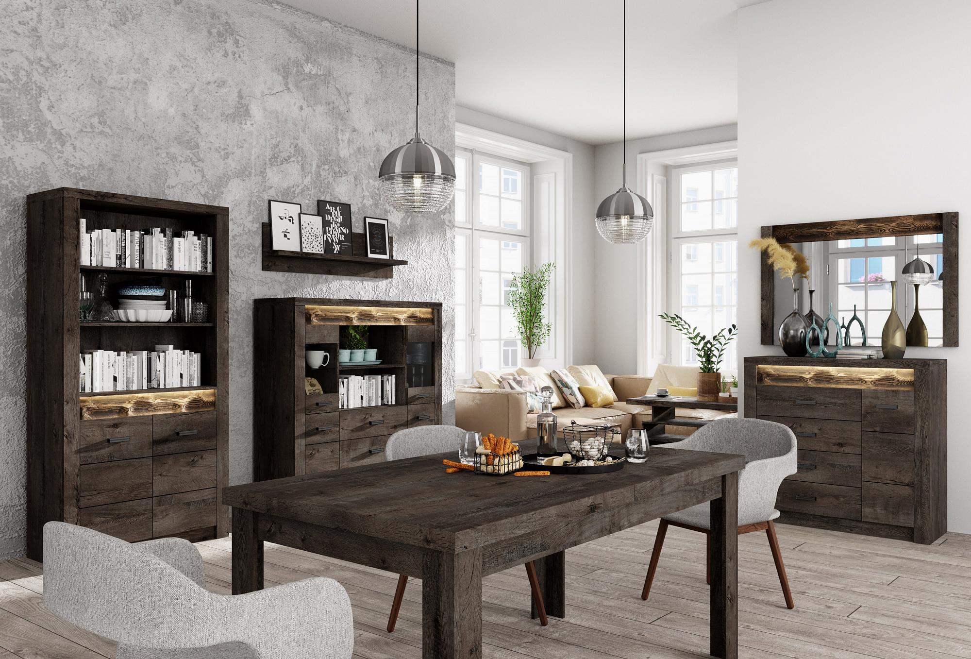 Moderní nábytek ve vyhledávaném dekoru dřeva. V robustním provedení, které vás zaujme hned na první pohled. Dekorativní čelní dubovou desku můžete u vitríny doplnit LED osvětlením. Ta zvýrazní její linii a nábytek pak působí velmi stylově.