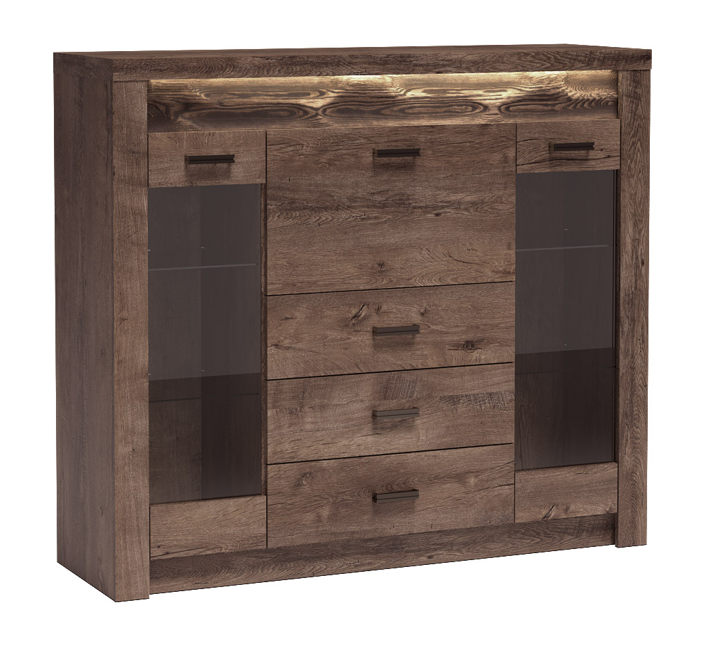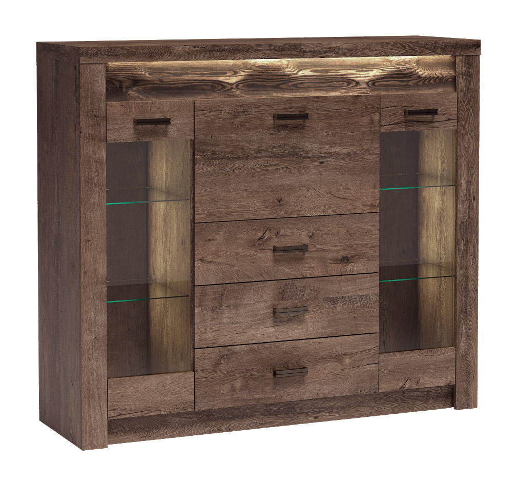 Moderní nábytek ve vyhledávaném dekoru dřeva. V robustním provedení, které vás zaujme hned na první pohled. Dekorativní čelní dubovou desku můžete u vitríny doplnit LED osvětlením. Ta zvýrazní její linii a nábytek pak působí velmi stylově.