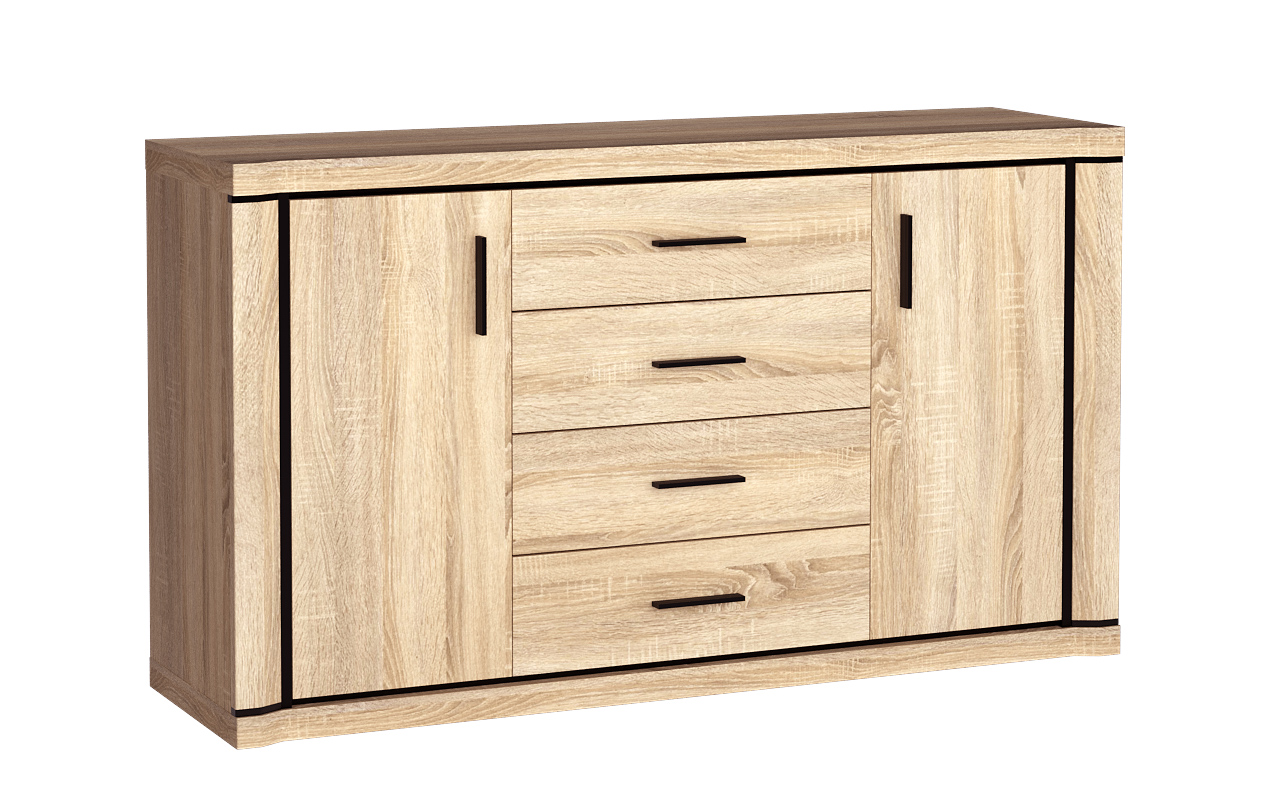Prostorná komoda se čtyřmi velkými zásuvkami a dvěma úložnými prostory s poličkami.