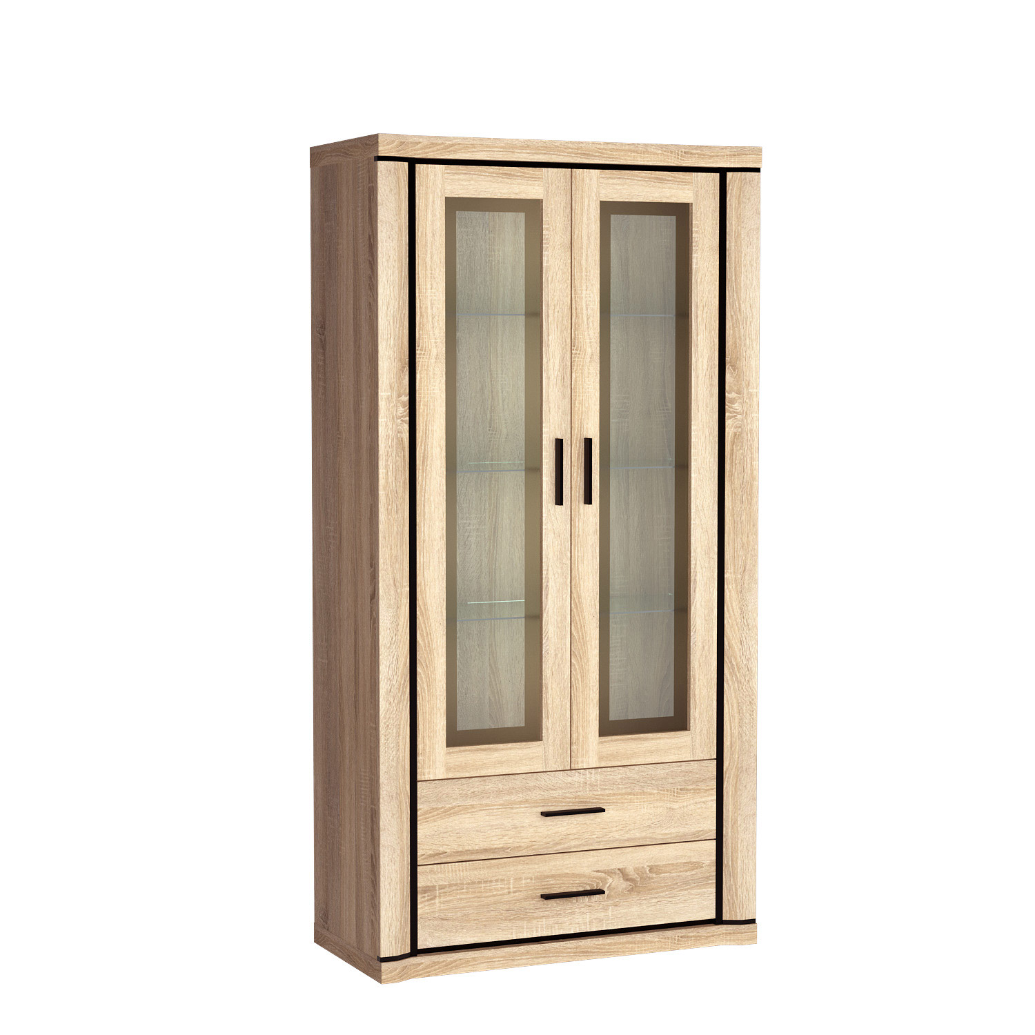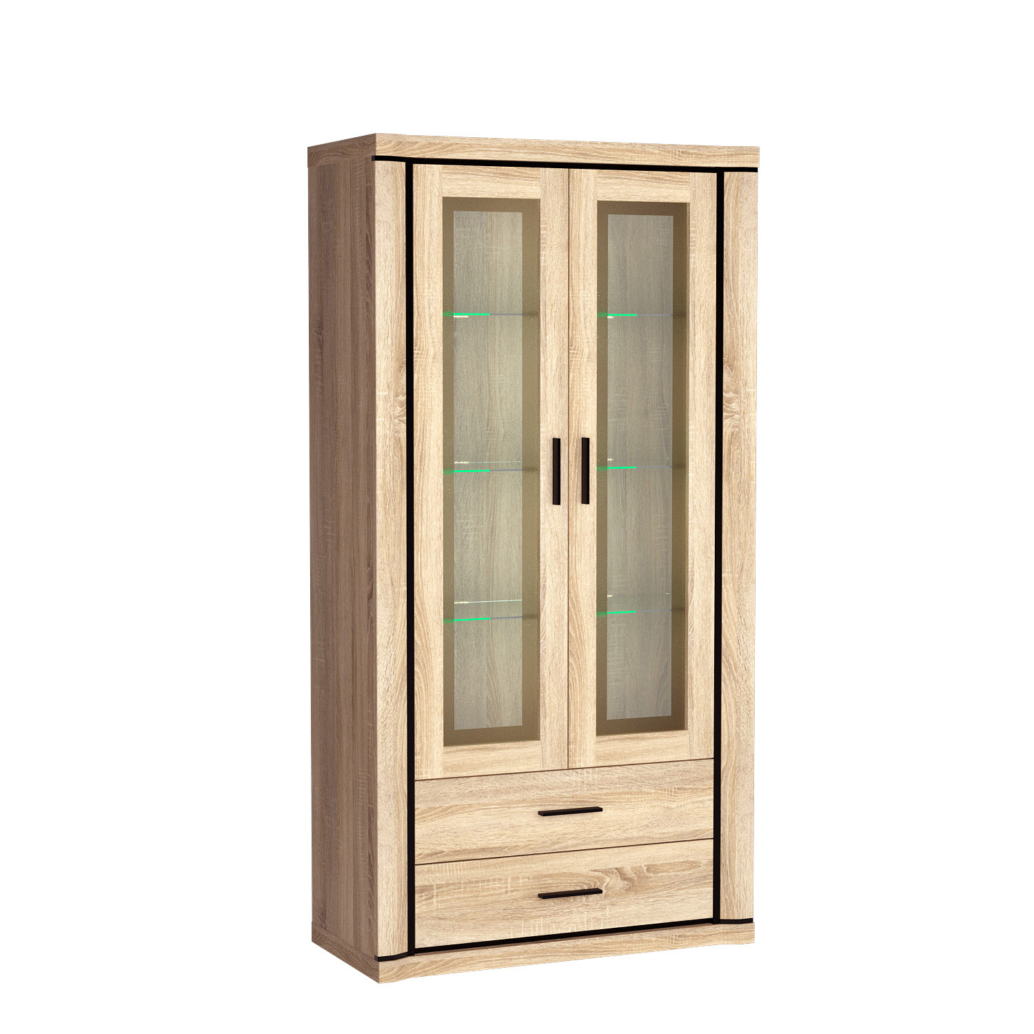 Velká vitrína se dvěma širokými zásuvkami. Dá se použít jako stylový bar a pokud dokoupíte LED osvětlení, nepochybně přiláká pozornost každého vašeho hosta.