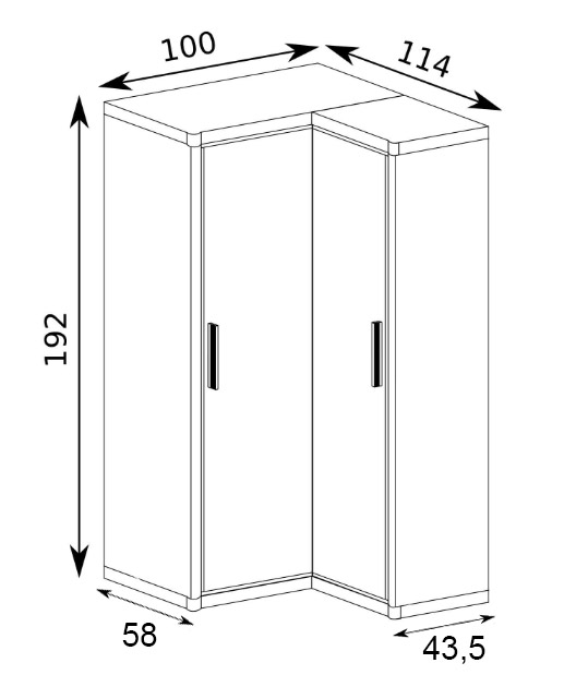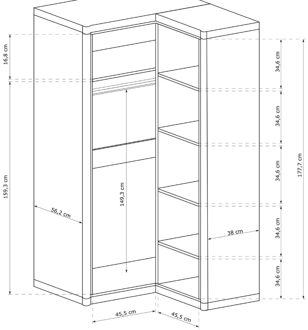 Velmi prostorná dvoudveřová skříň, která efektivně vyplní roh v místnosti. Levá část skříně obsahuje šatní tyč, nad kterou je velká police. V pravé části jsou čtyři police. Na tuto skříň můžete navázat libovolný počet skříní z kolekce Dallas a vytvoříte tak velký skříňový systém.