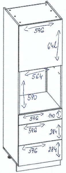 Korpusy skříněk jsou vyrobené z kvalitní LTD desky o tloušťce 18 mm ( s ABS 0,5 mm). Záda jsou z bílého sololitu a vnitřní police mají nosnost 15-25 kg. Kování BLUM nebo Hettich s doživotní zárukou (úchytky, kování a sokly jsou v ceně) a všechna dvířka i zásuvky disponují systémem tlumeného dovírání (kromě zásuvek Blum METABOX). Skříňky stojí na nastavitelných nožkách o výšce 10 nebo 15 cm.