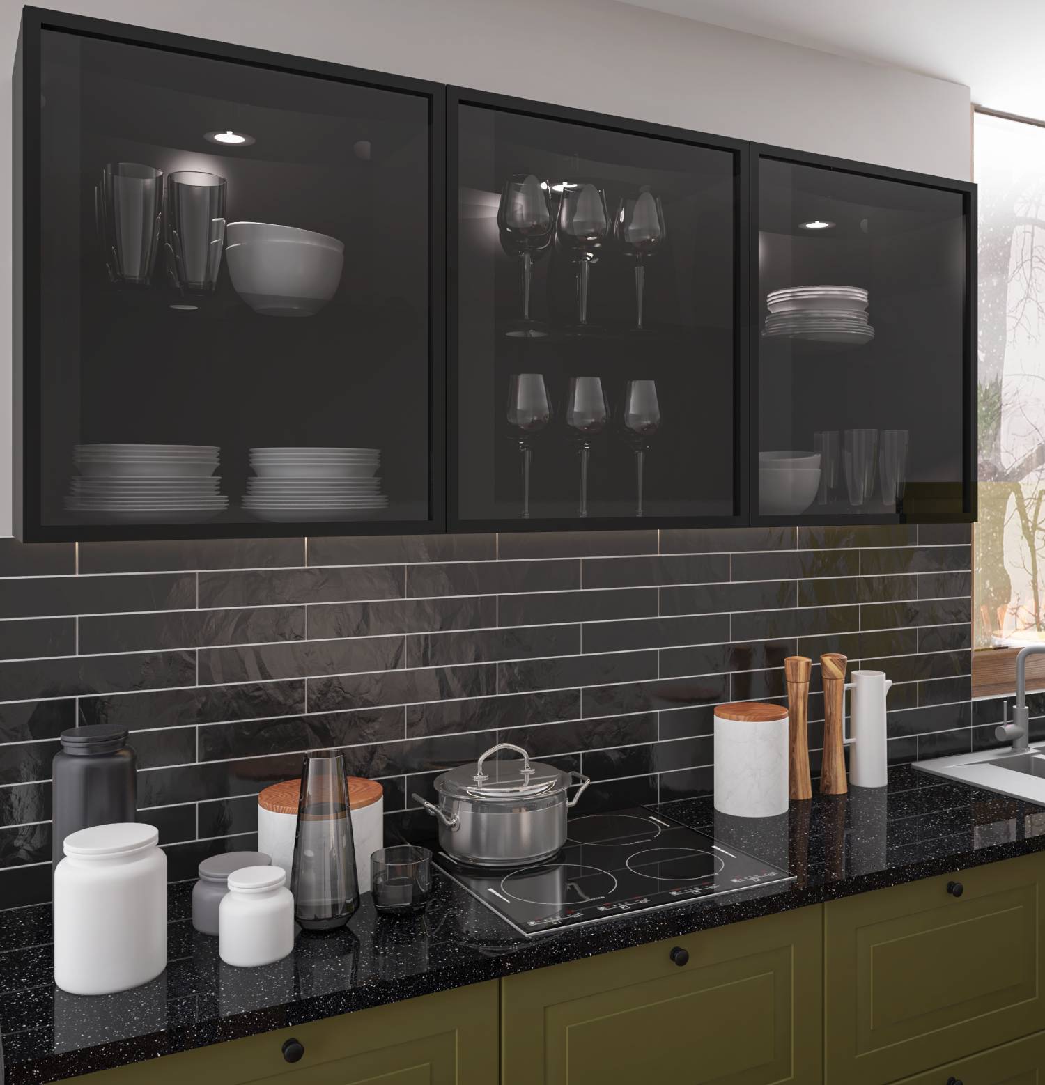 Designová kuchyňská skříňka Black ALU, černé korpusy 18 mm, čiré sklo a kovové úchytky. Univerzální použití ke každému typu kuchyně.