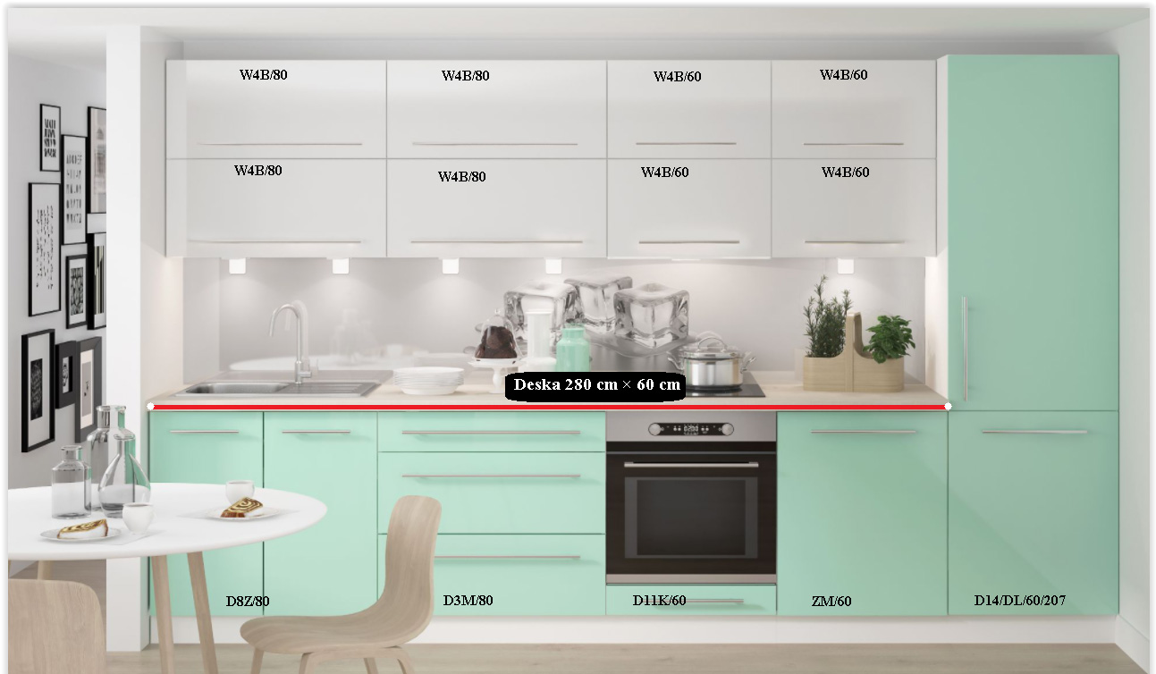 Skříňky se dodávají v demontu a můžete je seřadit libovolně, nemusíte se držet pořadí na fotografii. Pokud vám složení sestavy nevyhovuje, můžete si poskládat vlastní kuchyni na míru z horních a dolních skříněk.