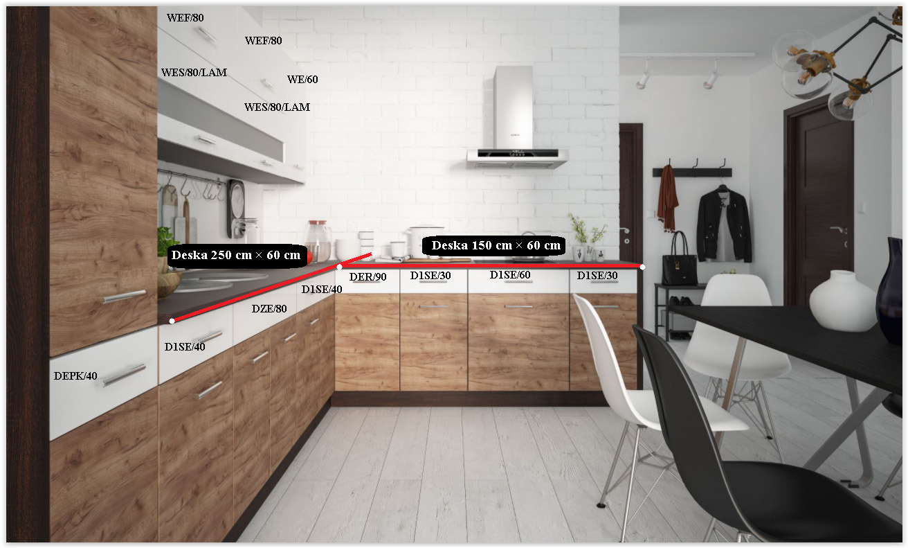 Skříňky se dodávají v demontu a můžete je seřadit libovolně, nemusíte se držet pořadí na fotografii. Pokud vám složení sestavy nevyhovuje, můžete si poskládat vlastní kuchyni na míru z horních a dolních skříněk.